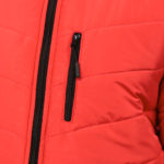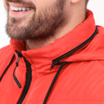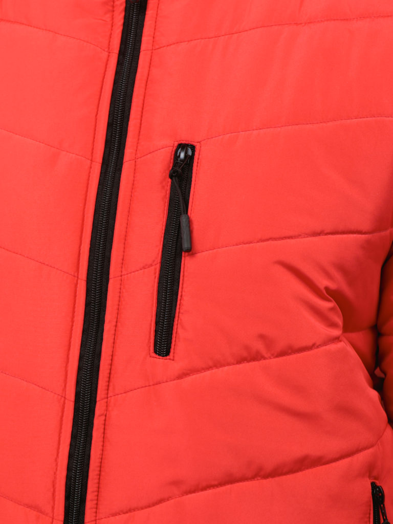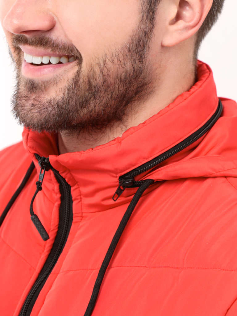 Jaqueta puffer masculina com capuz que guarda na gola, com bolso adicional no peito, e todos os bolsos com zíper.