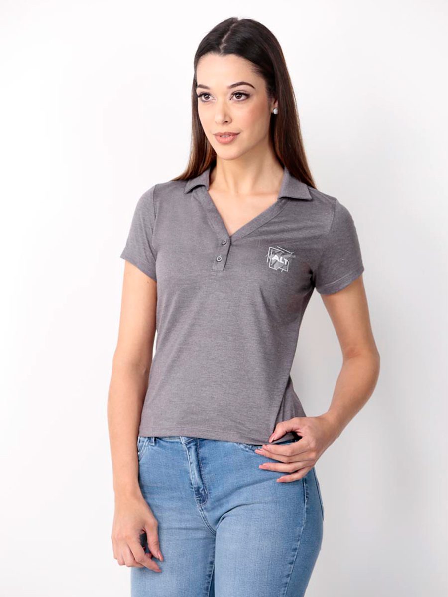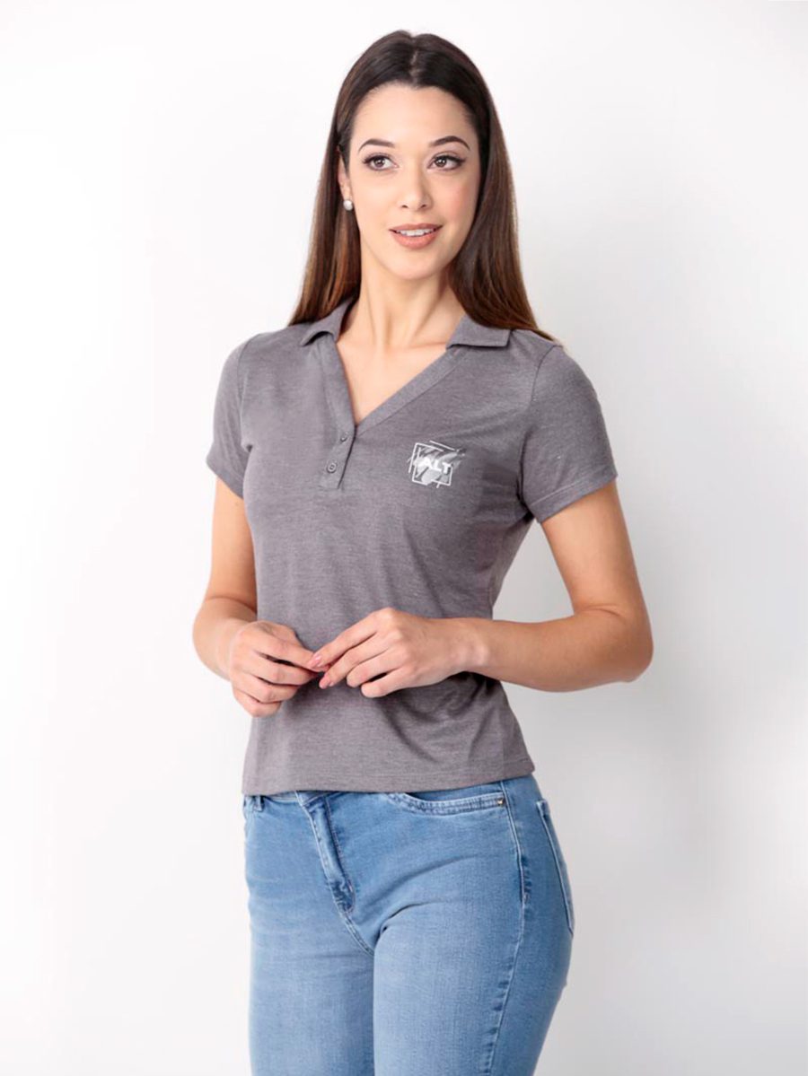 Baby look feminina com gola estilo polo e decote em V.
