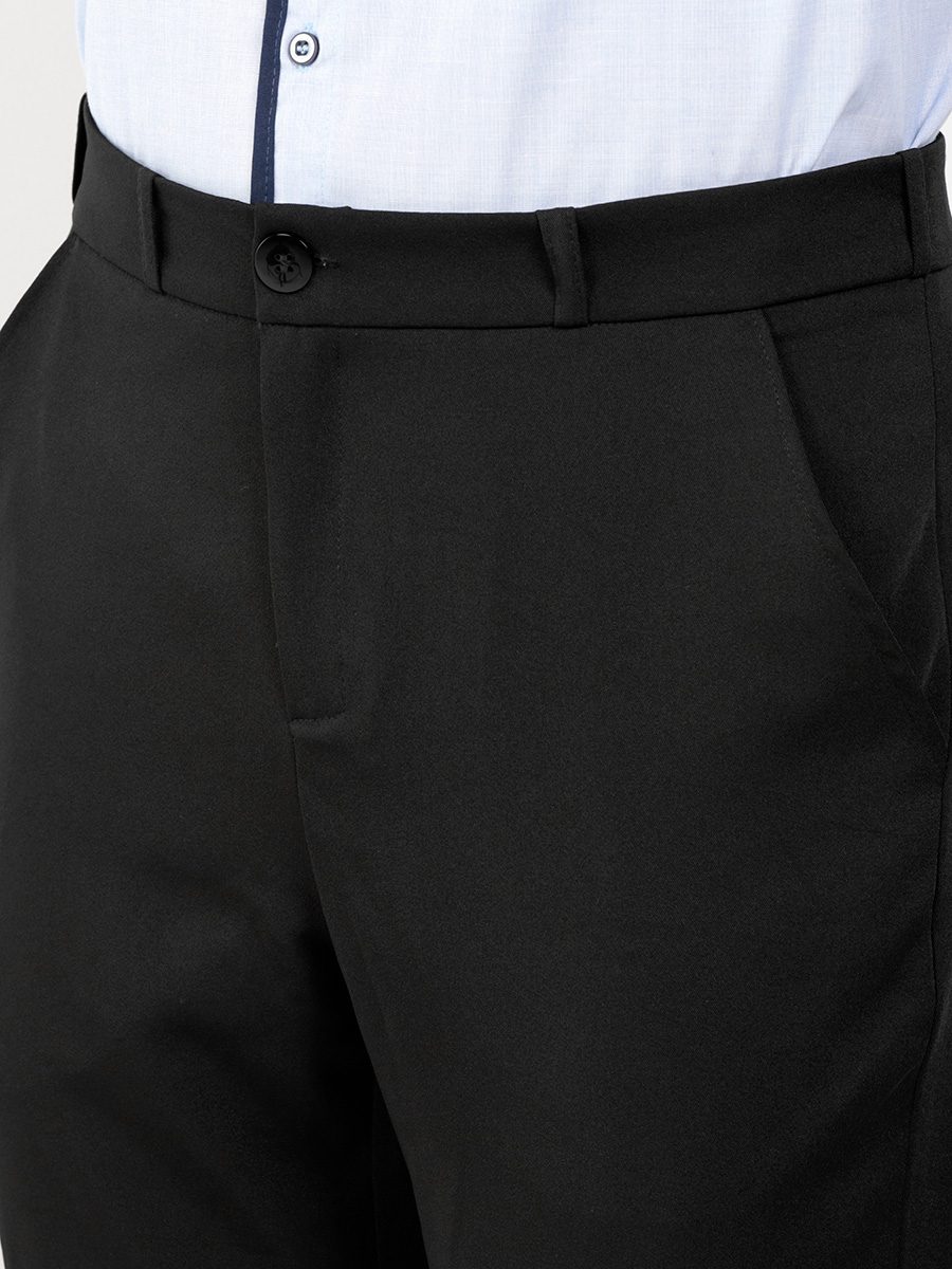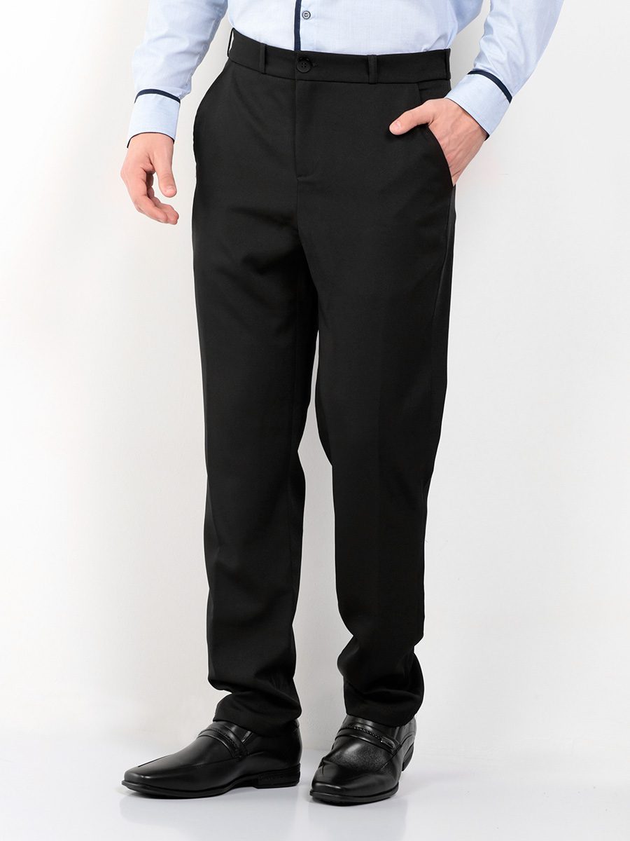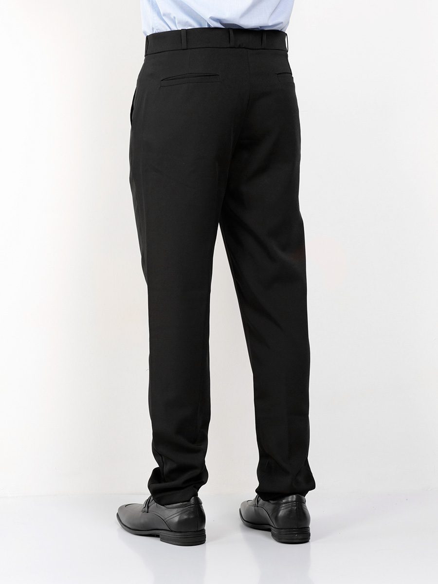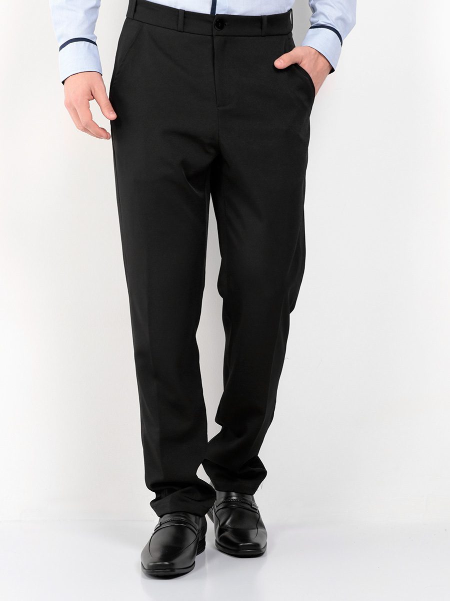 Calça social masculina, com 4 passantes no cós da frente e no cós da costa, bolso faca com pesponto largo, bolso traseiro modelo janela com 1 aba pespontado ao redor, frizo com ferro e pences.