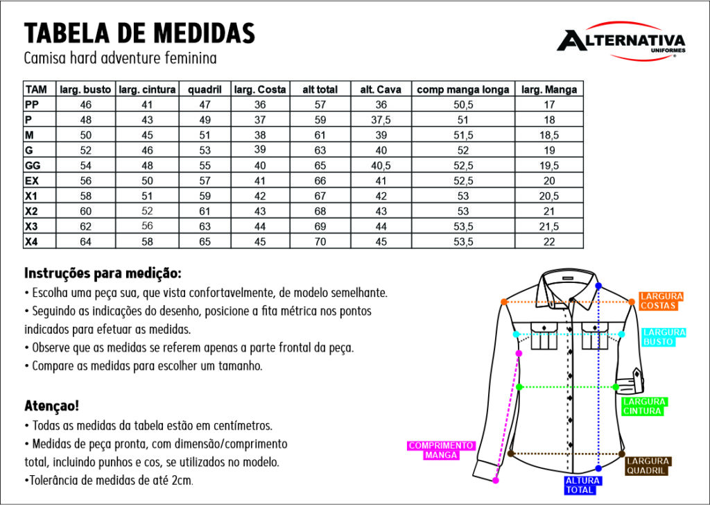Camisa Agro feminina, com dois bolsos na frente, abertura nas laterais das costas para passagem do ar, carcela com botão nas mangas.