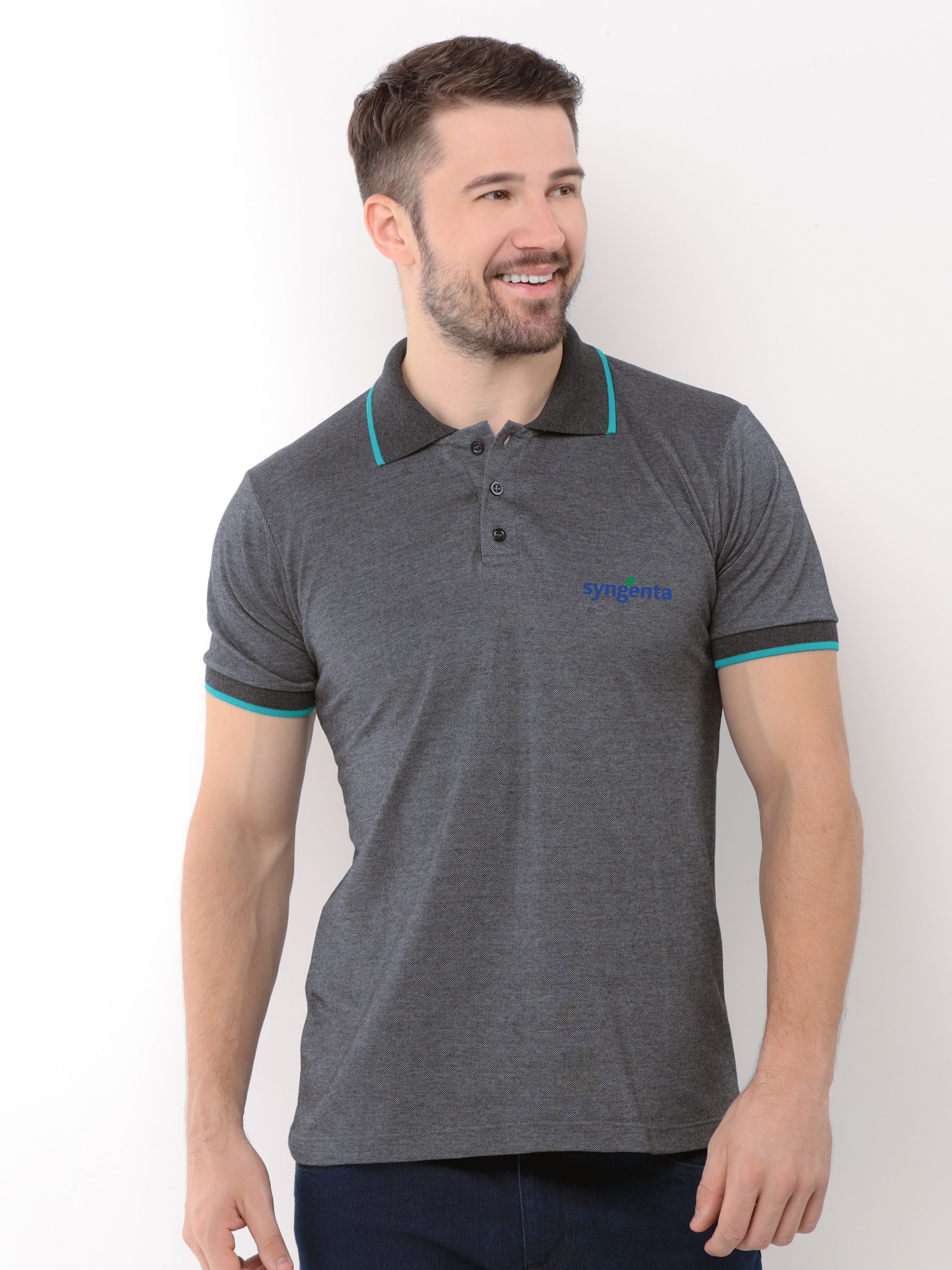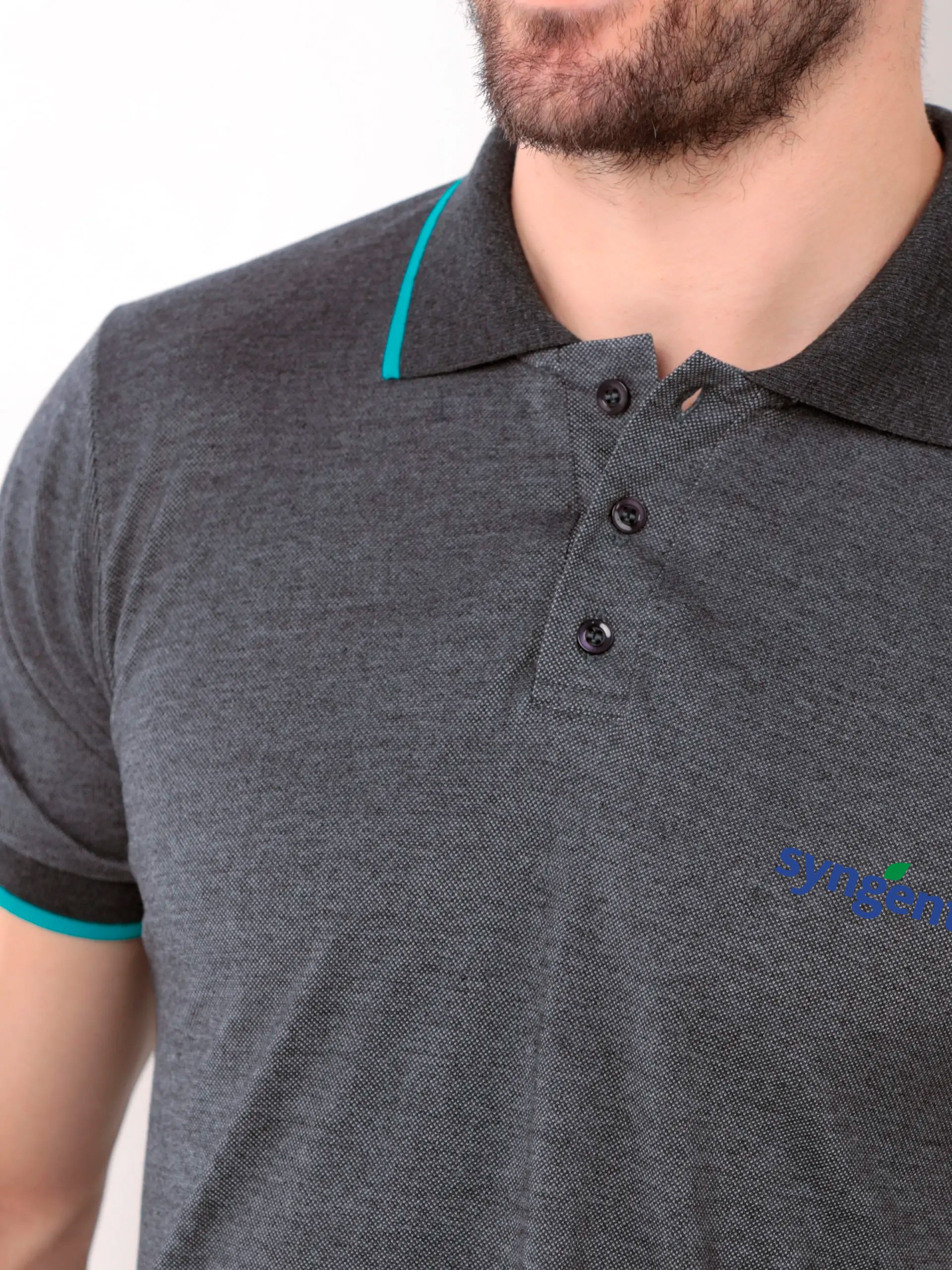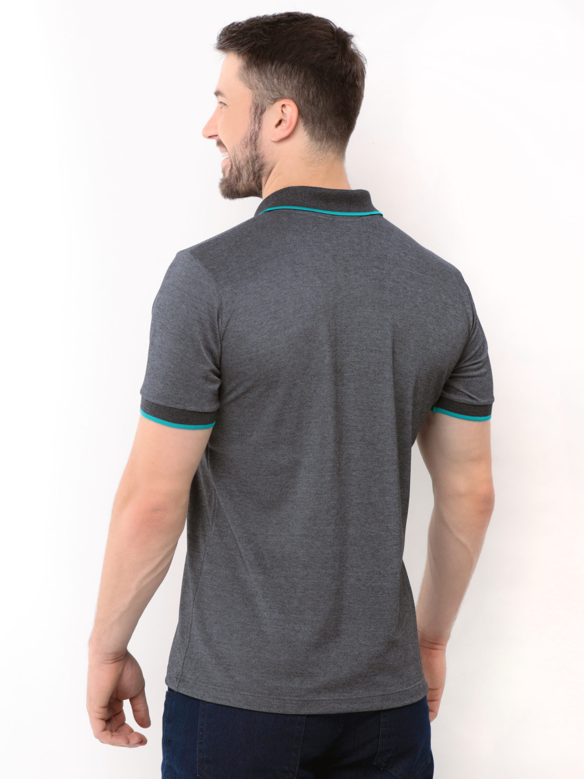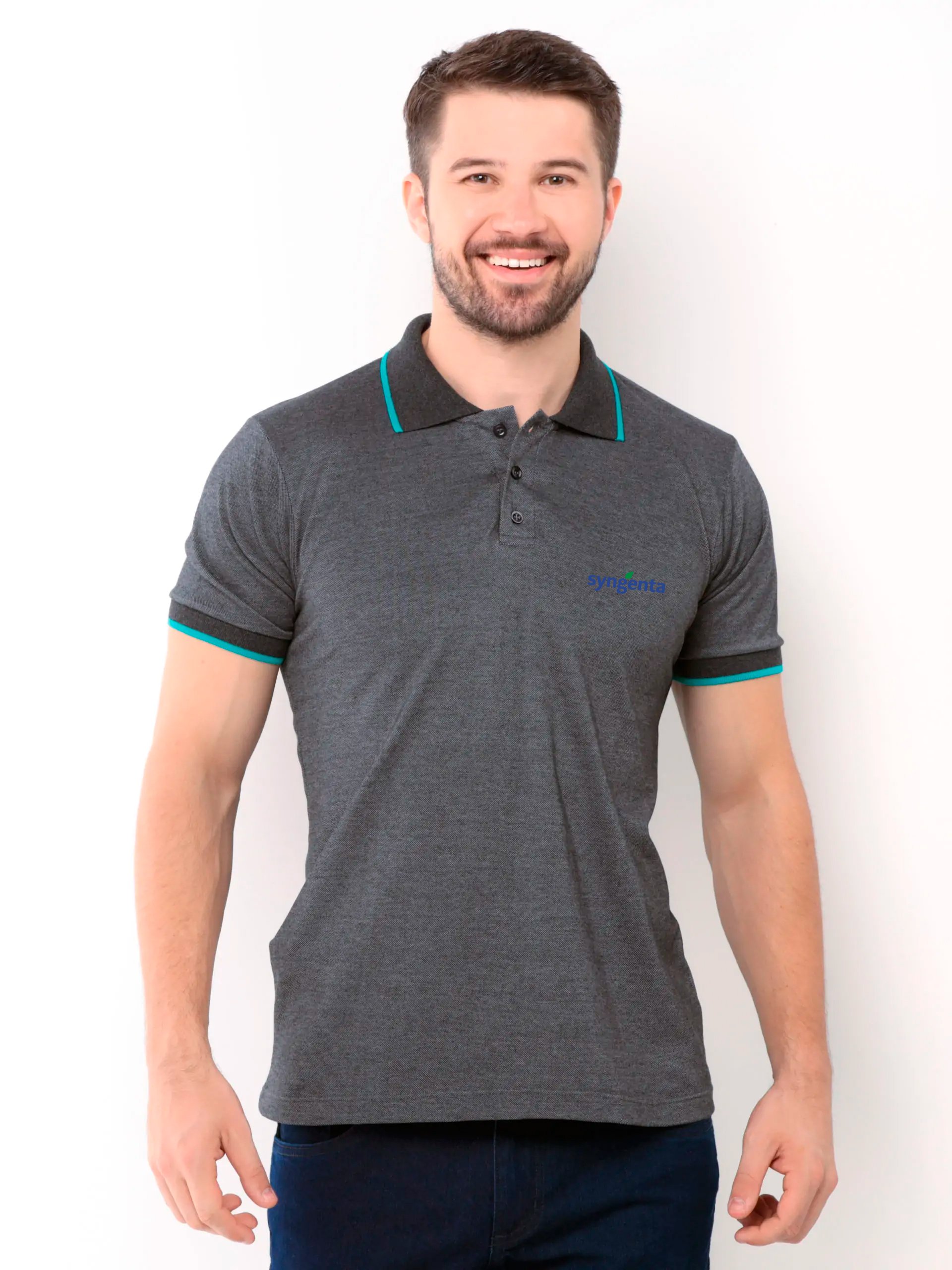 Camisa gola polo masculina, manga curta, com punho e gola.