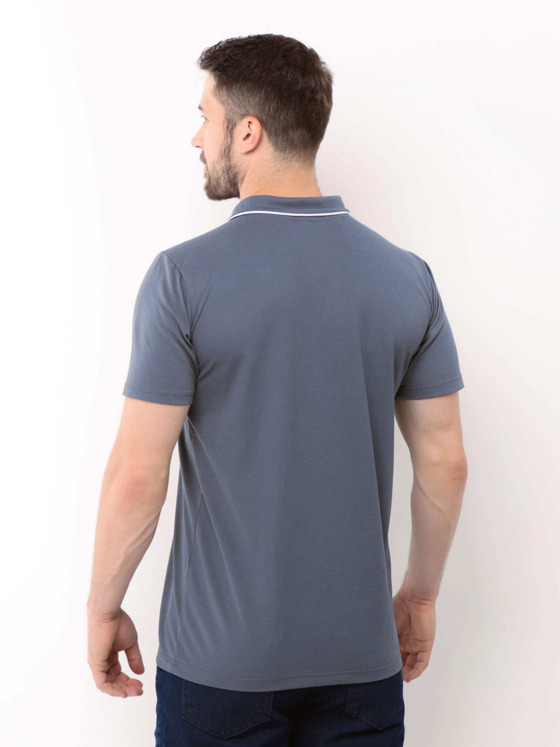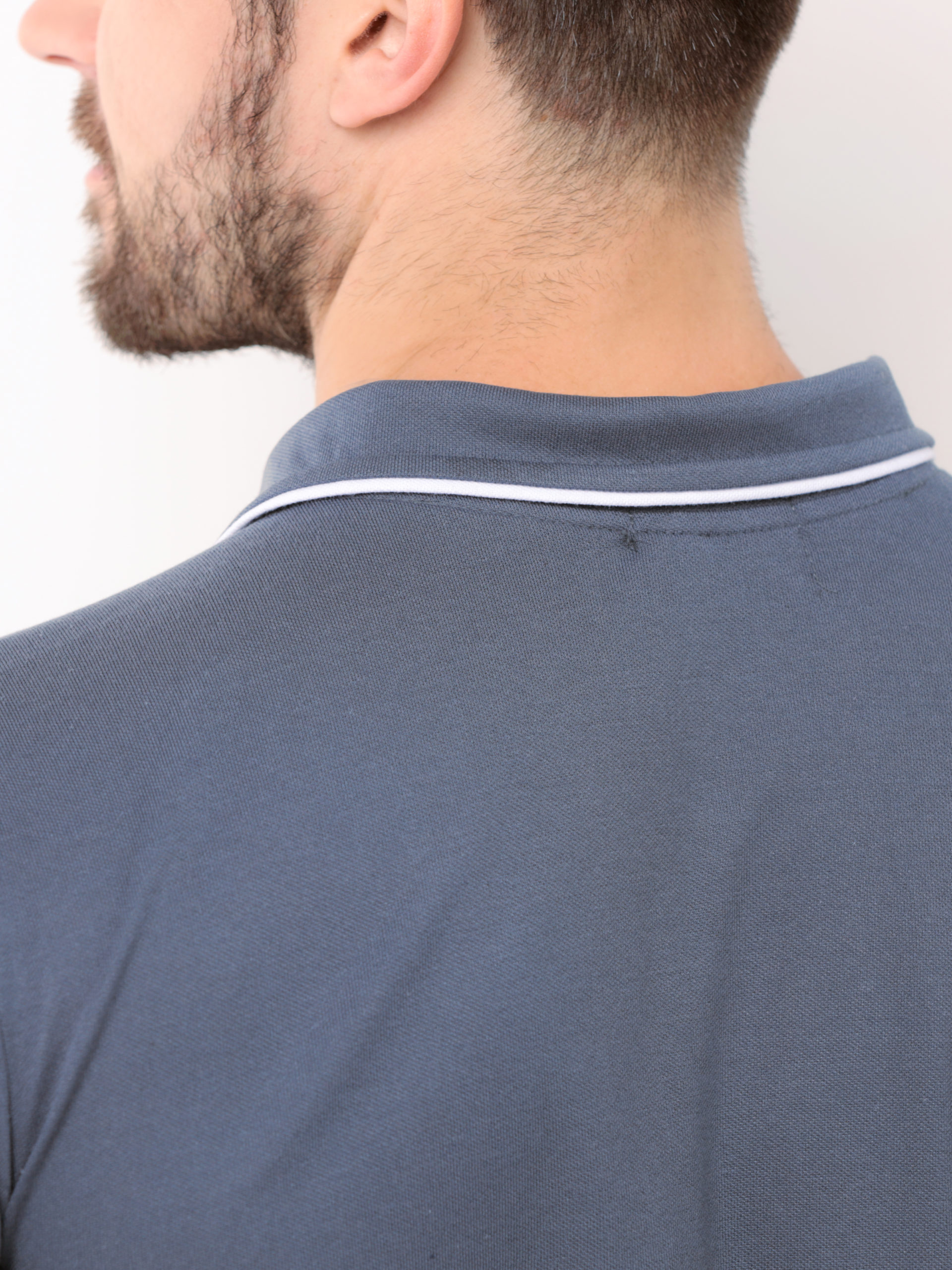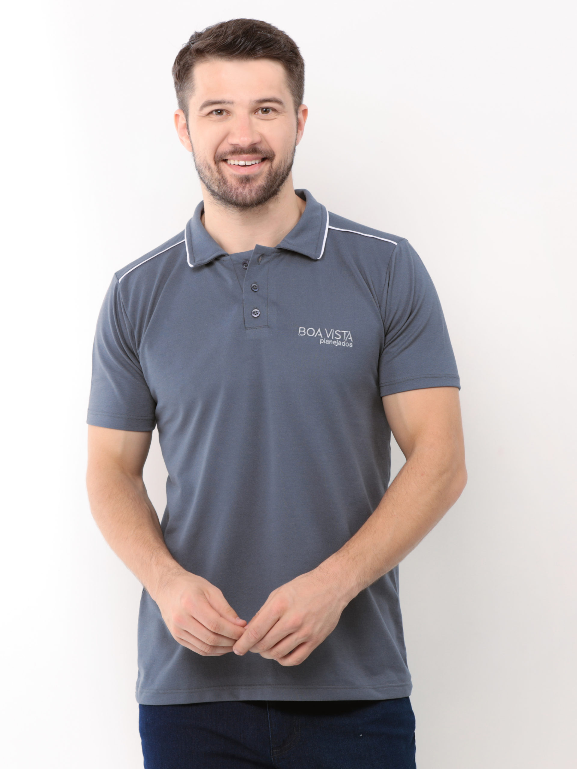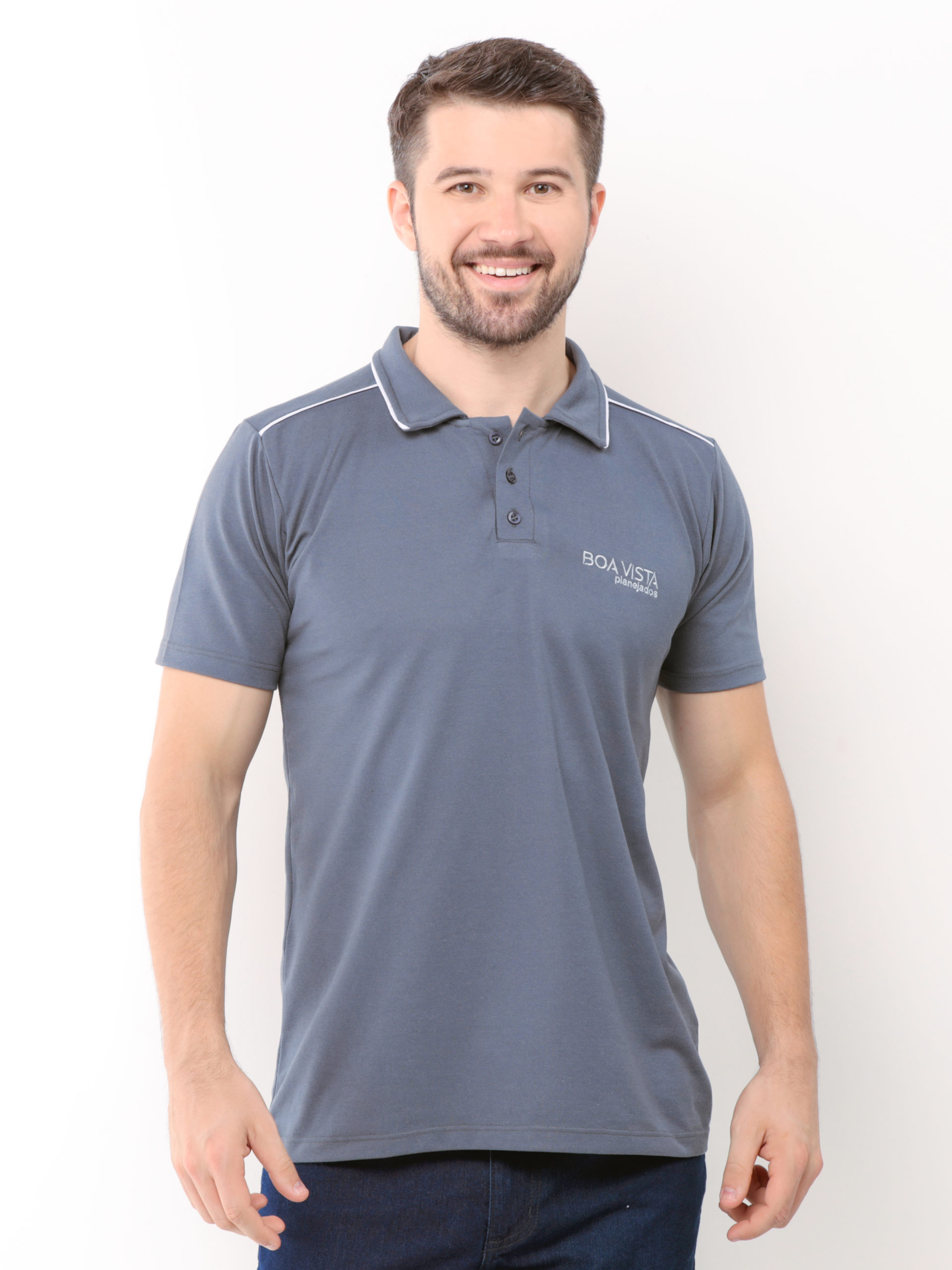 Camisa gola polo masculina, manga curta, com viés nos ombros e na gola .