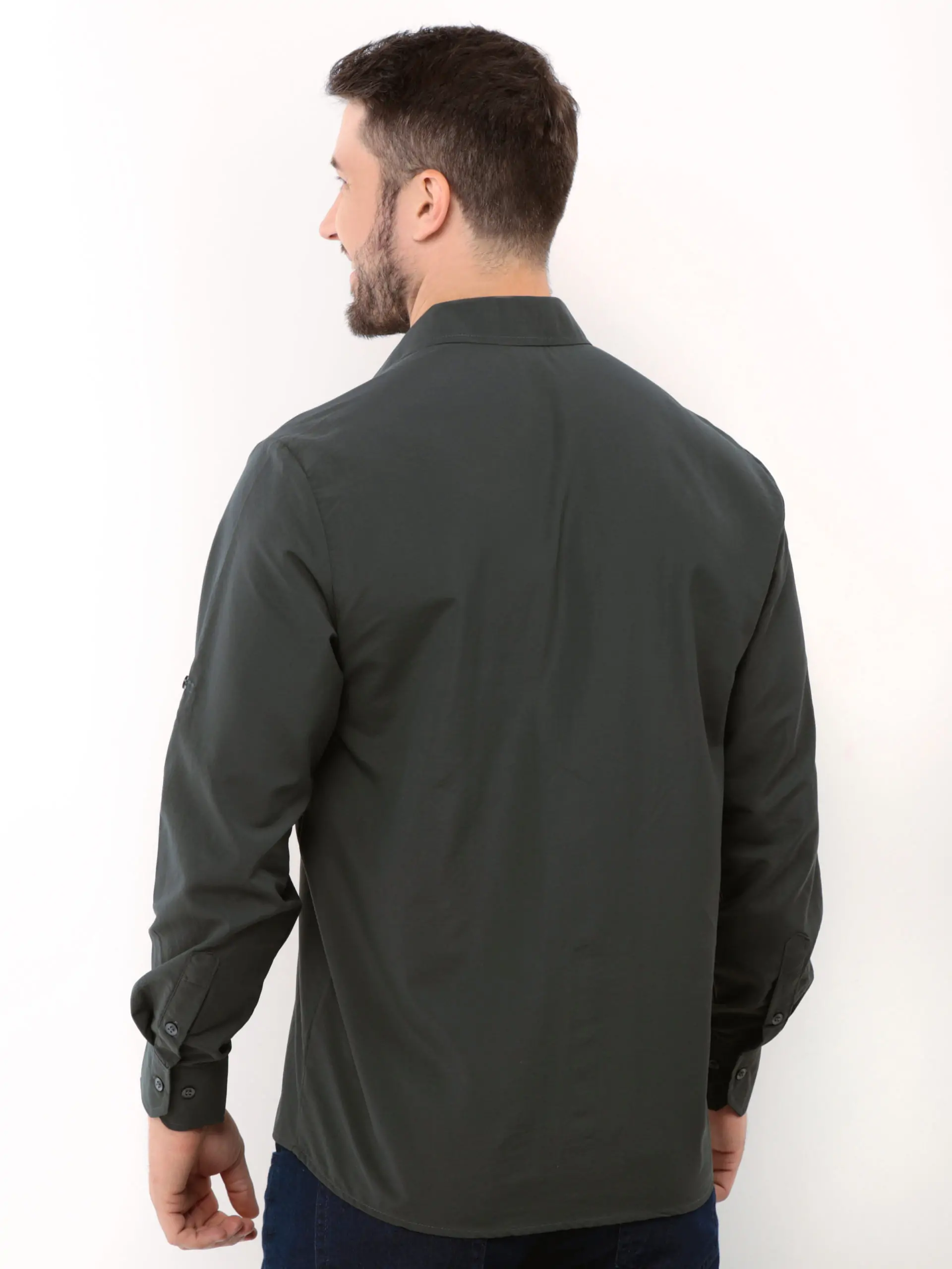 Camisa Agro masculina, com dois bolsos na frente e martingale nas mangas.