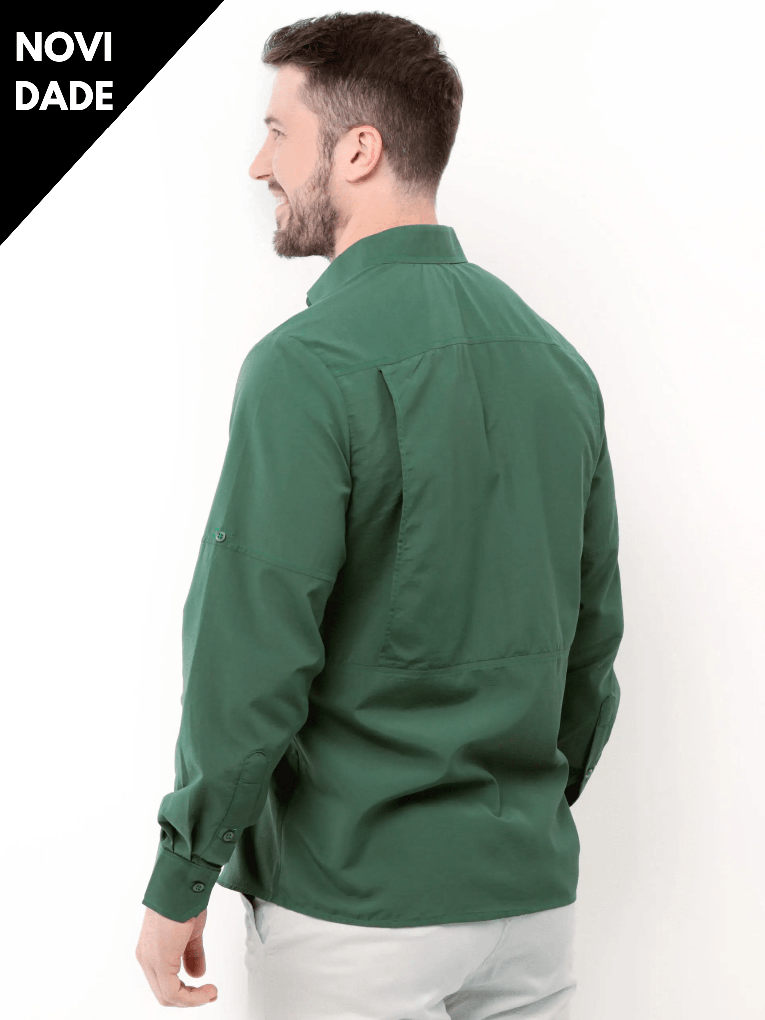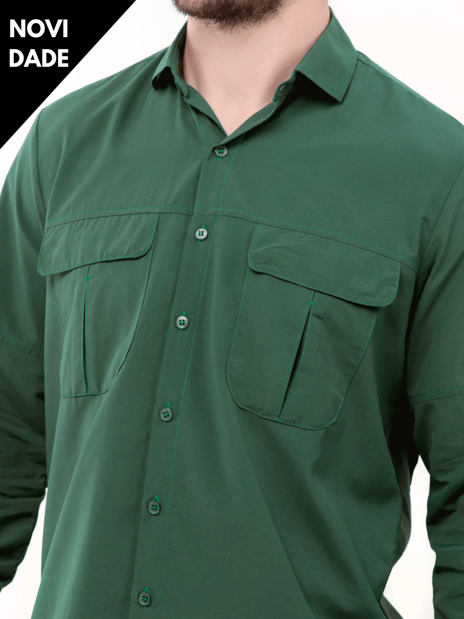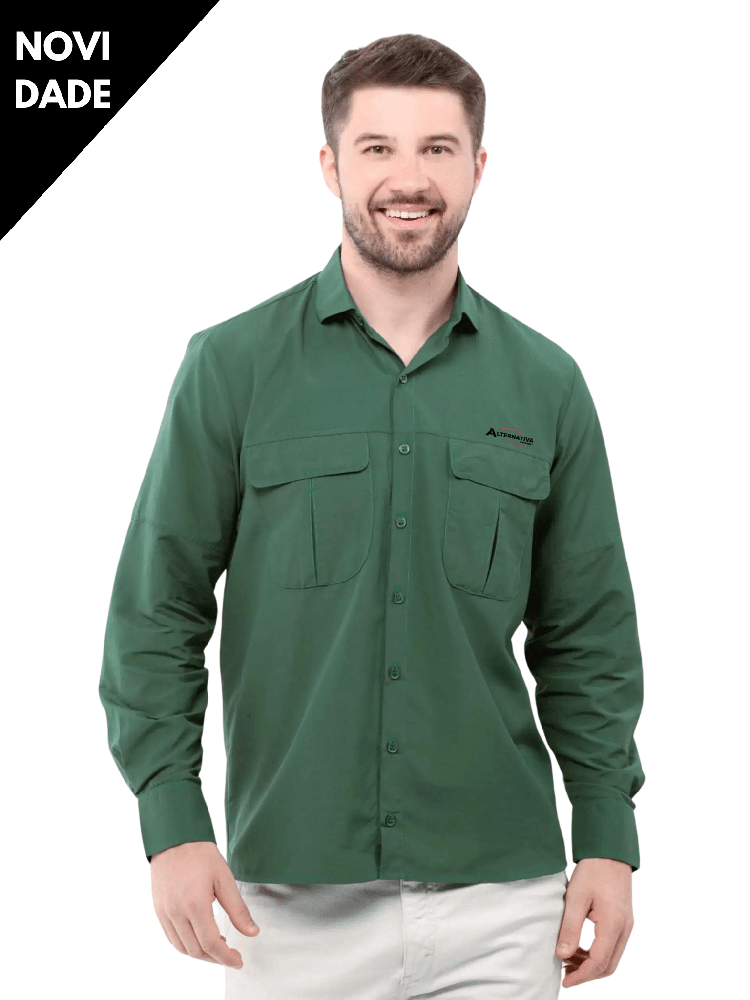 Camisa Agro masculina, com dois bolsos na frente, com abertura nas laterais das costas, carcela com botão nas mangas.
