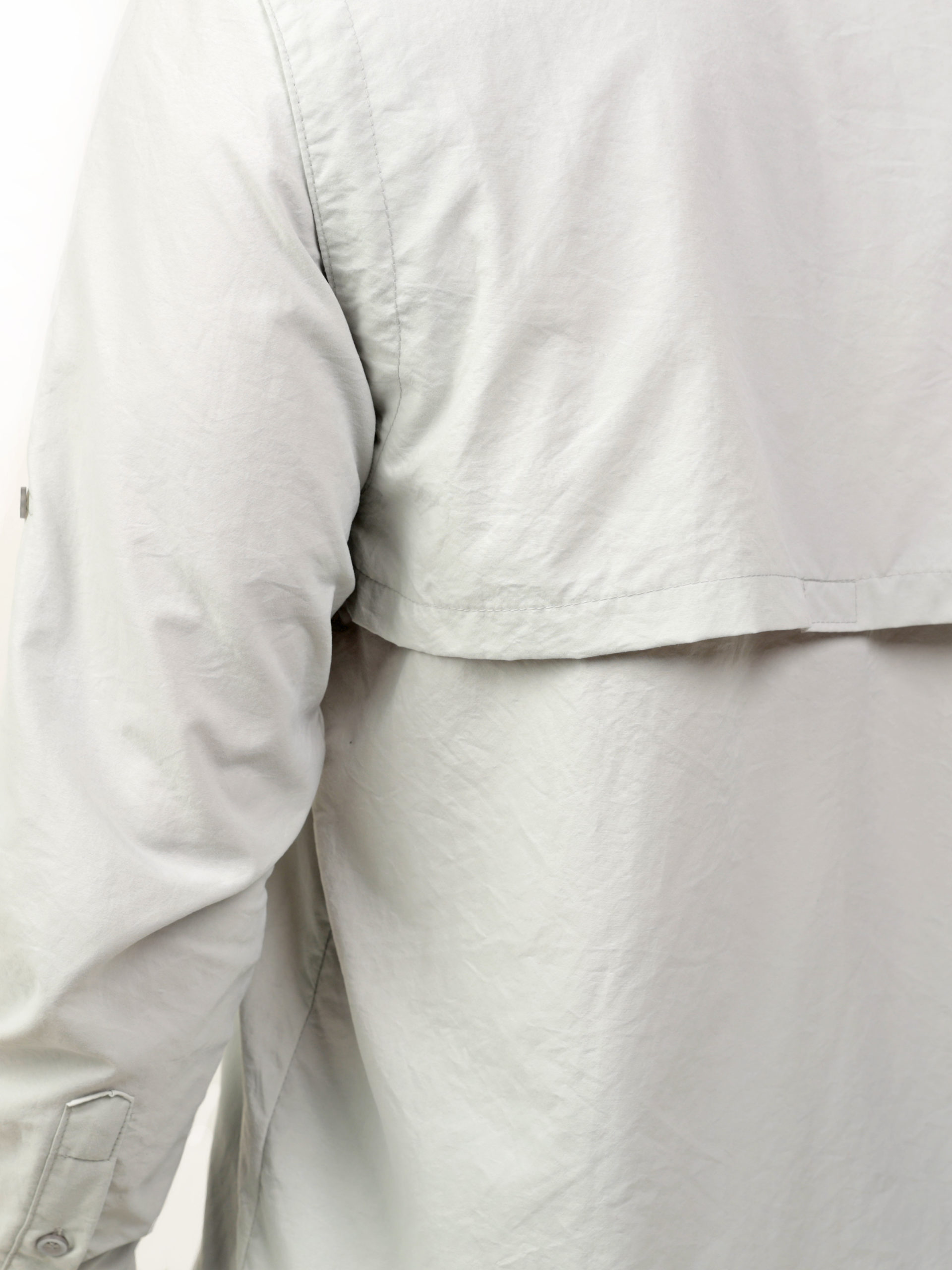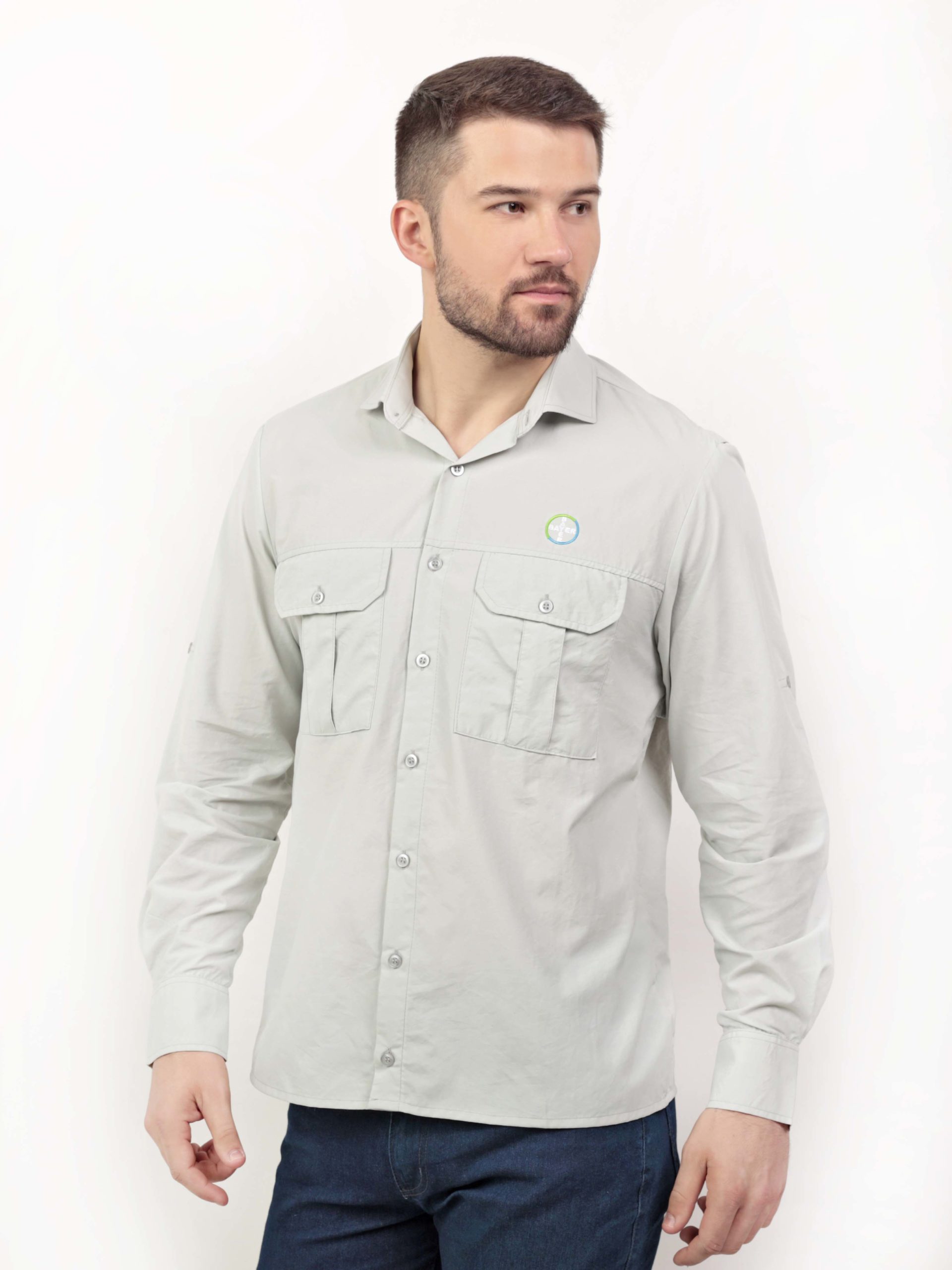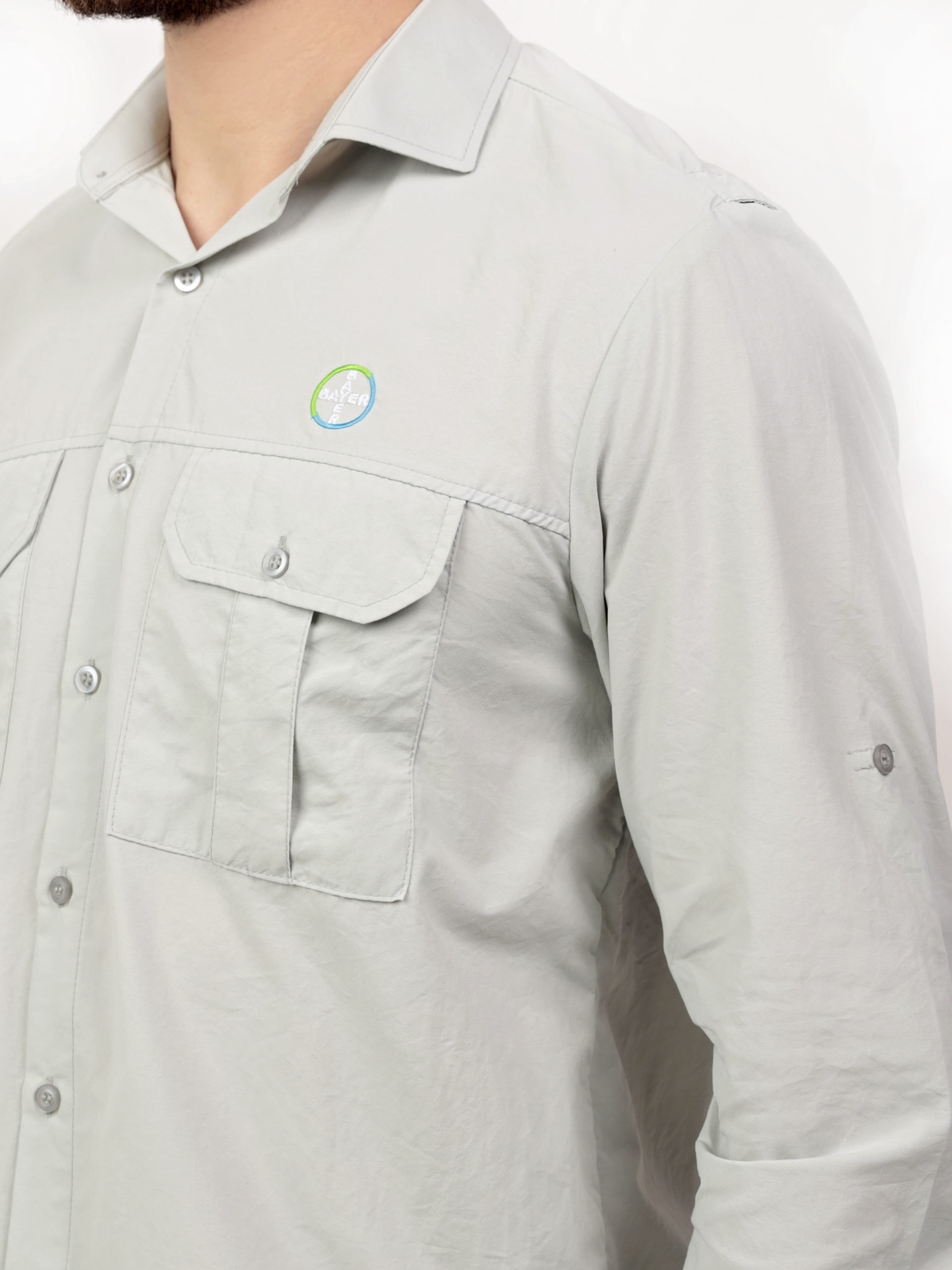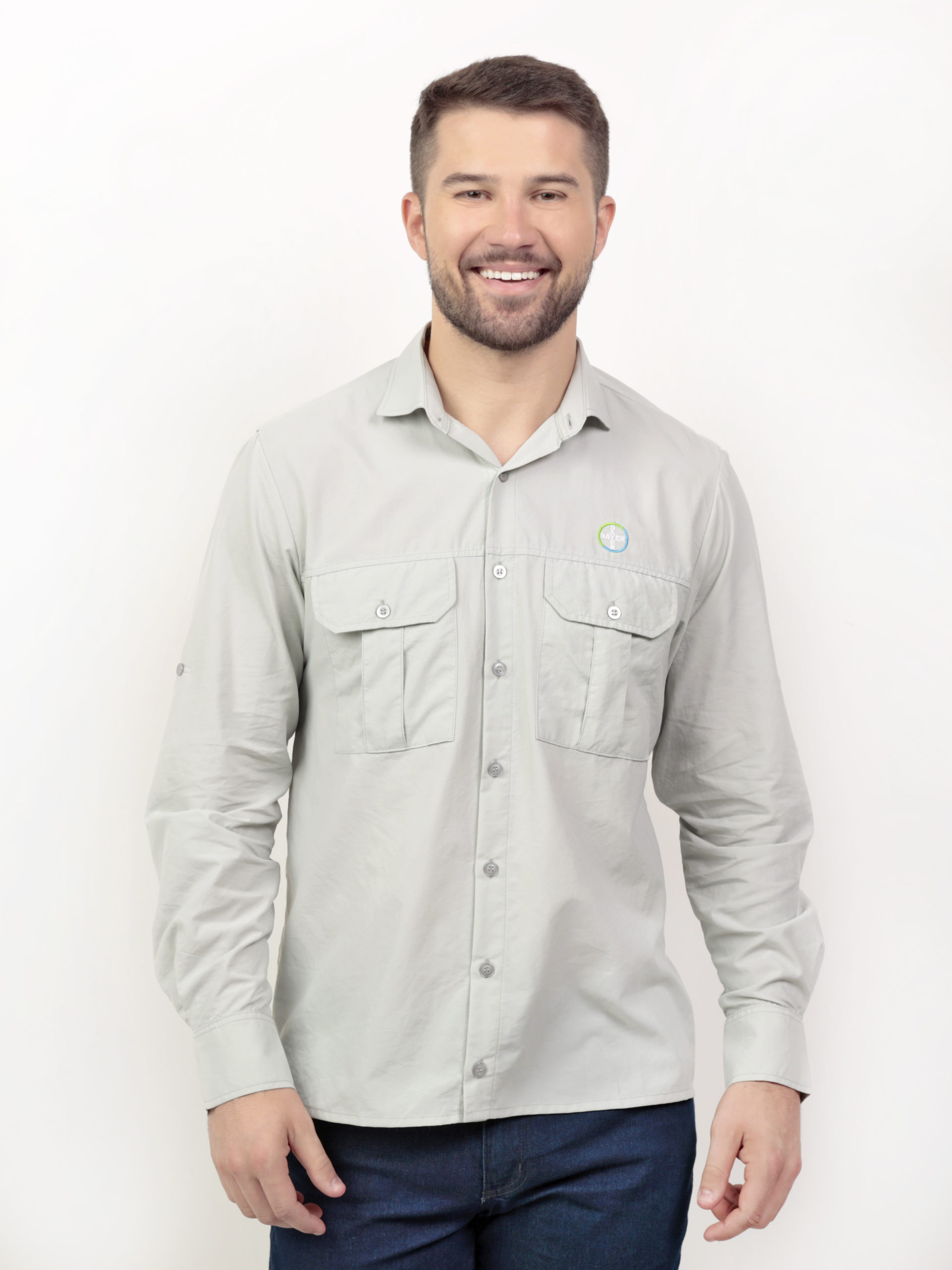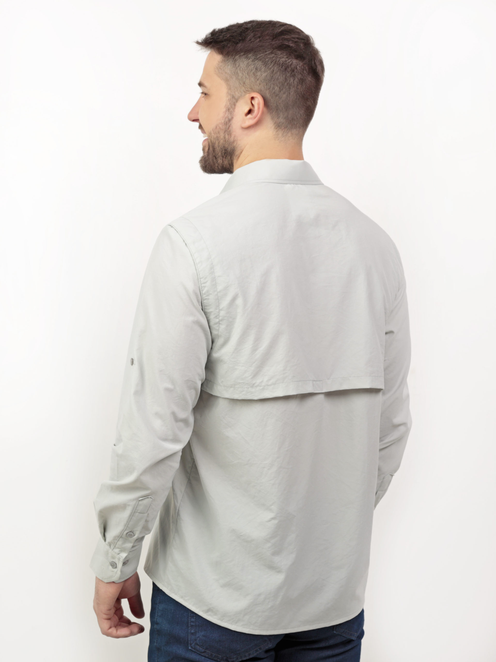 Camisa Agro masculina, com bolso duplo nas frentes esquerda e direita, abertura nas costas com vélcro para passagem do ar, carcela com botão nas mangas.