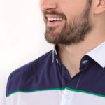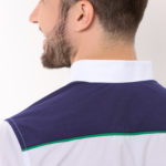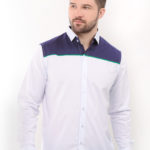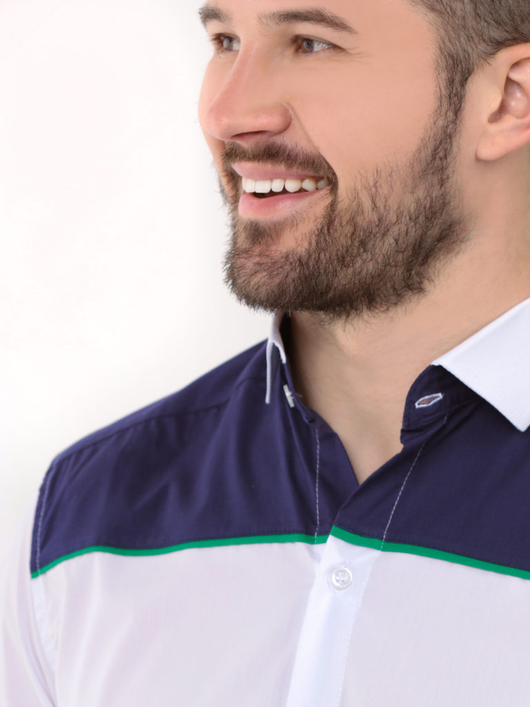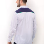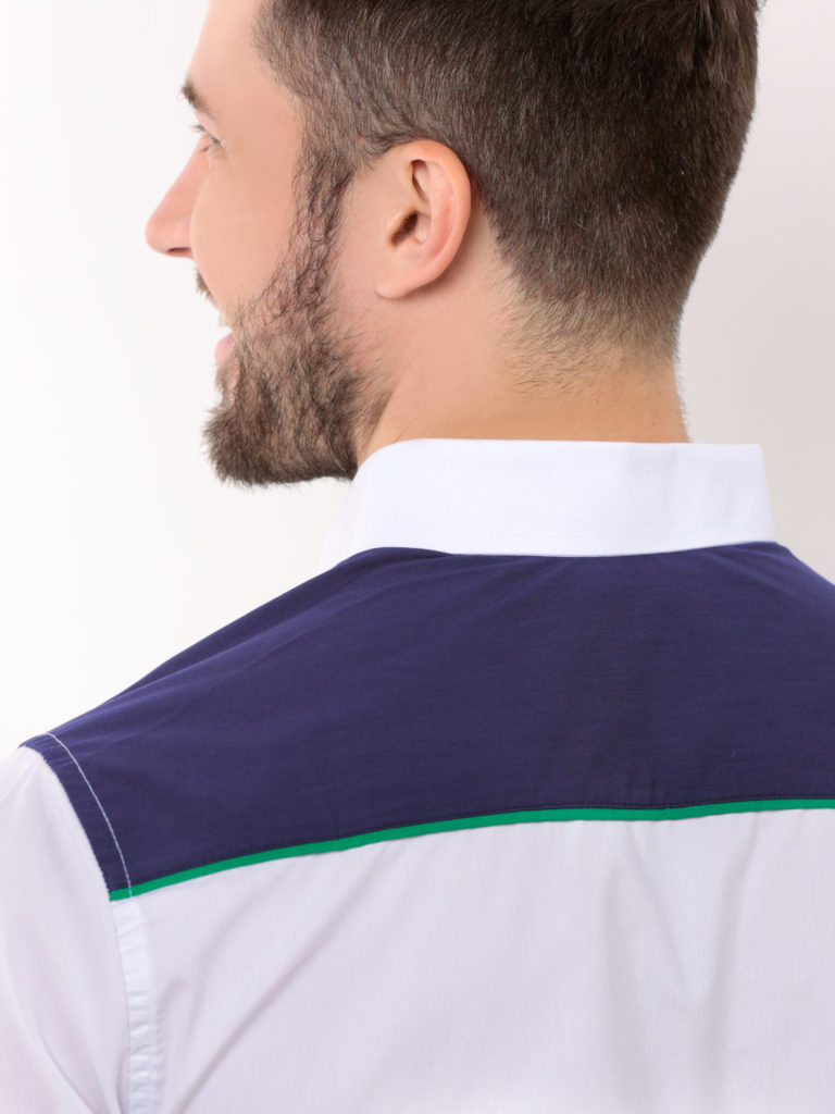 Camisa social masculina com recorte superior frontal e viés colorido no recorte.