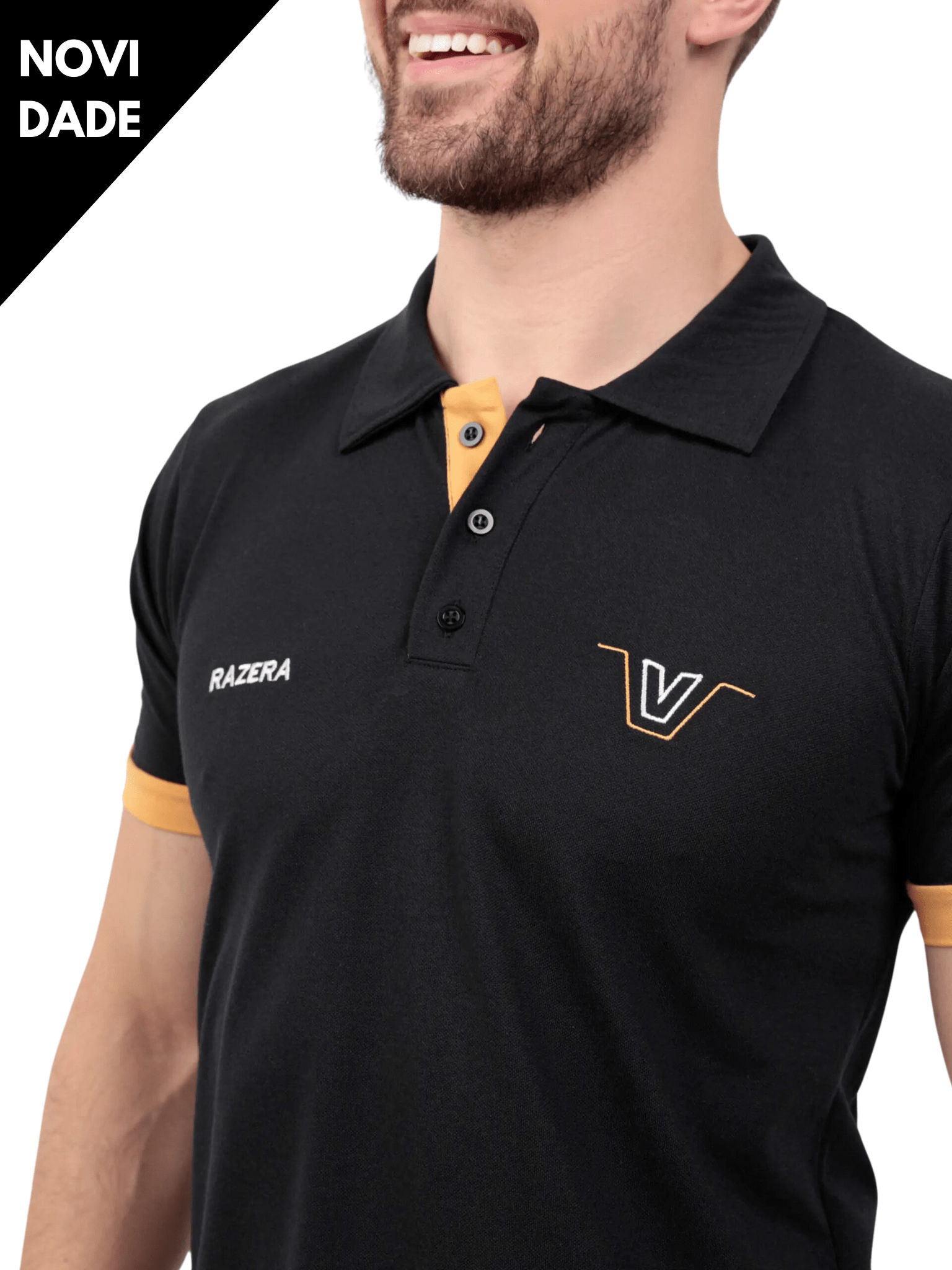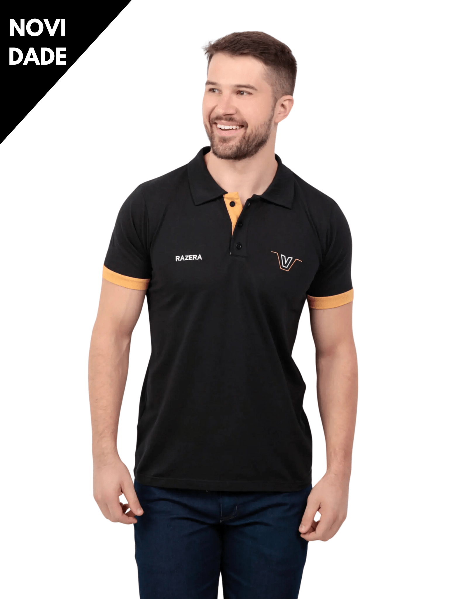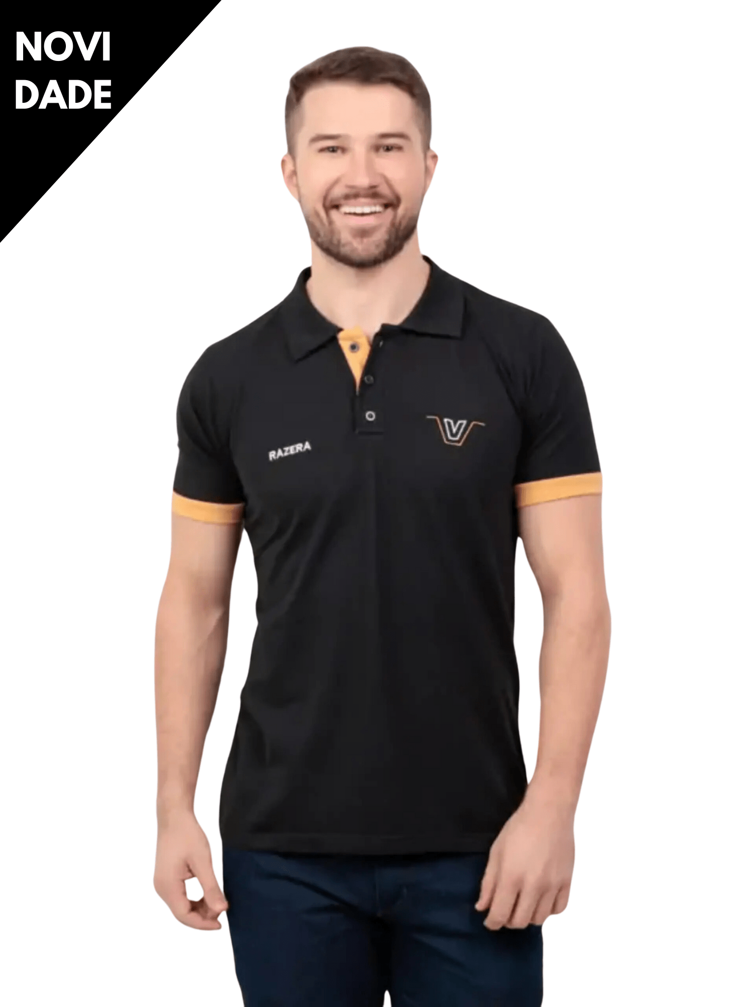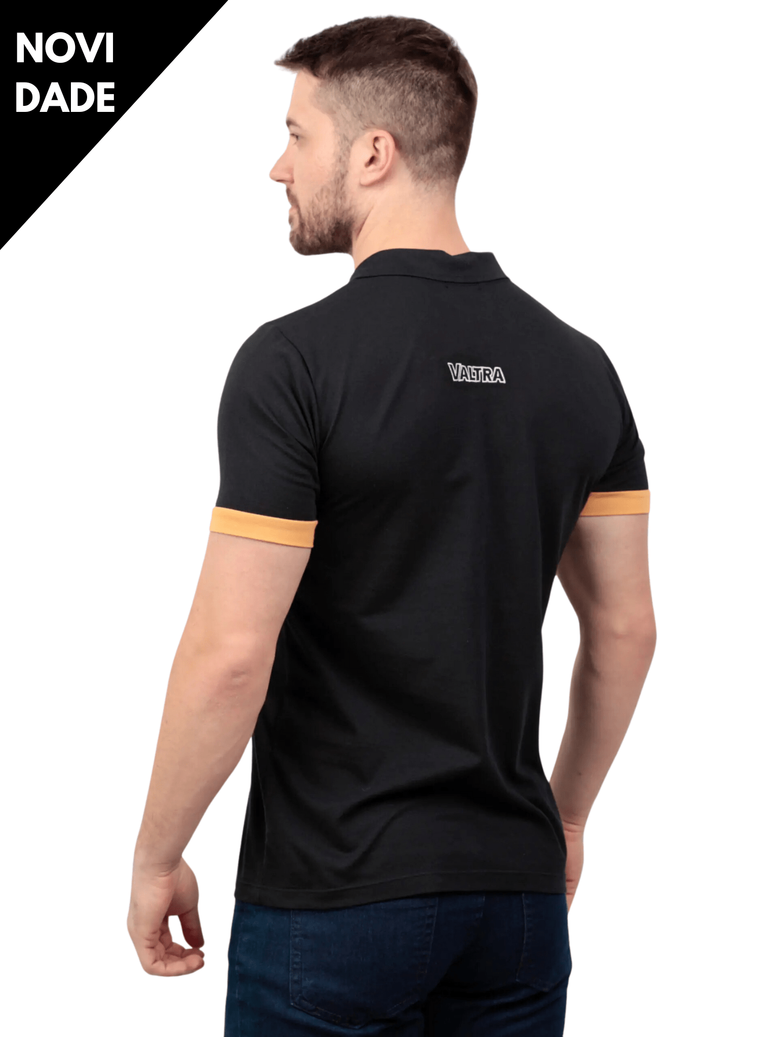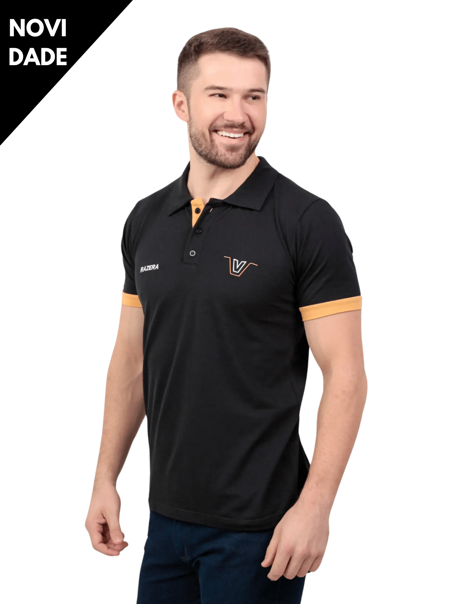 Polo masculina manga curta, detalhe na frente do botão, nas mangas mesma cor da frentinha.