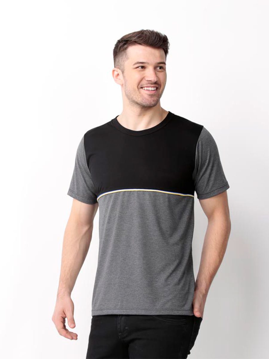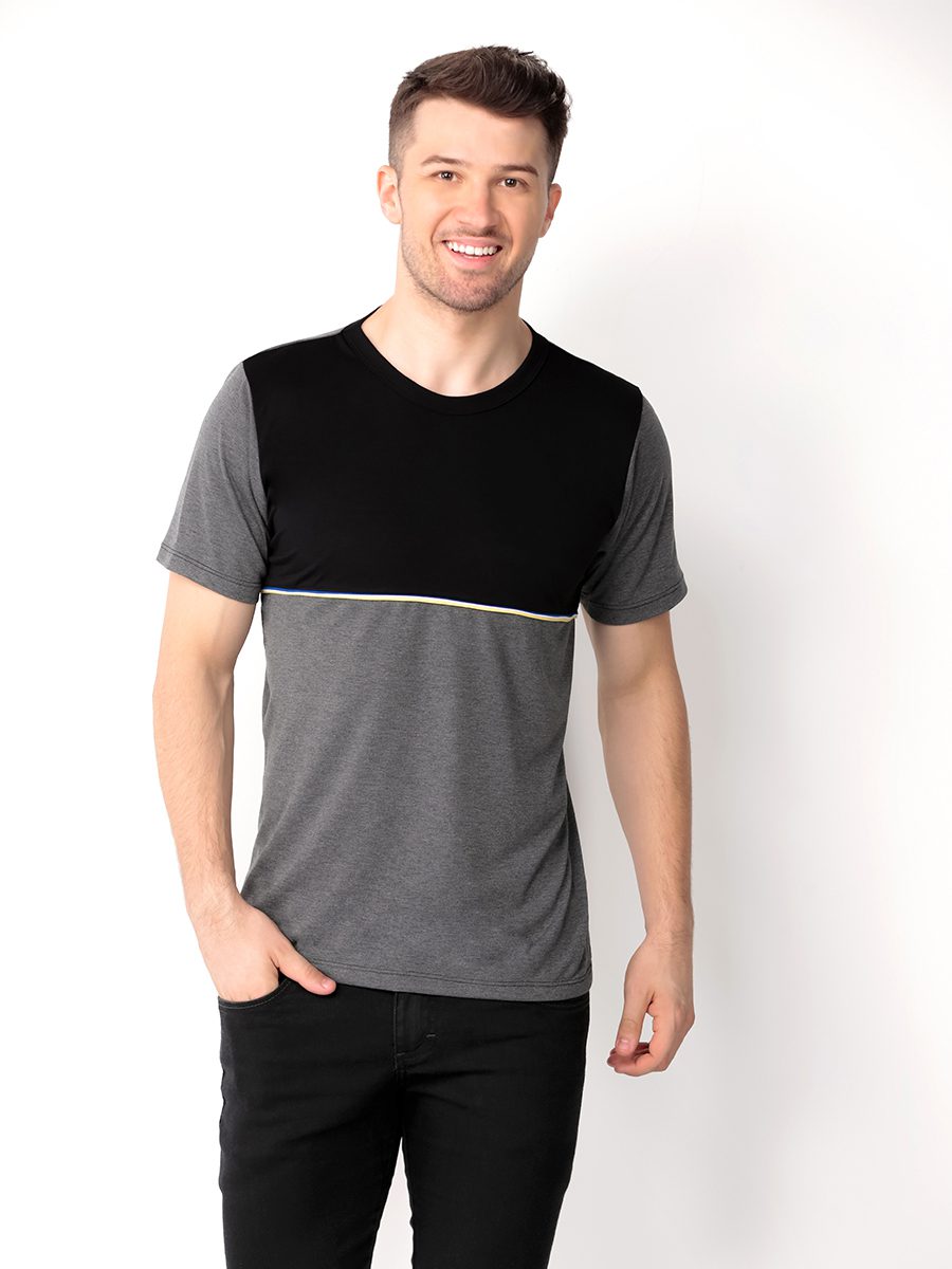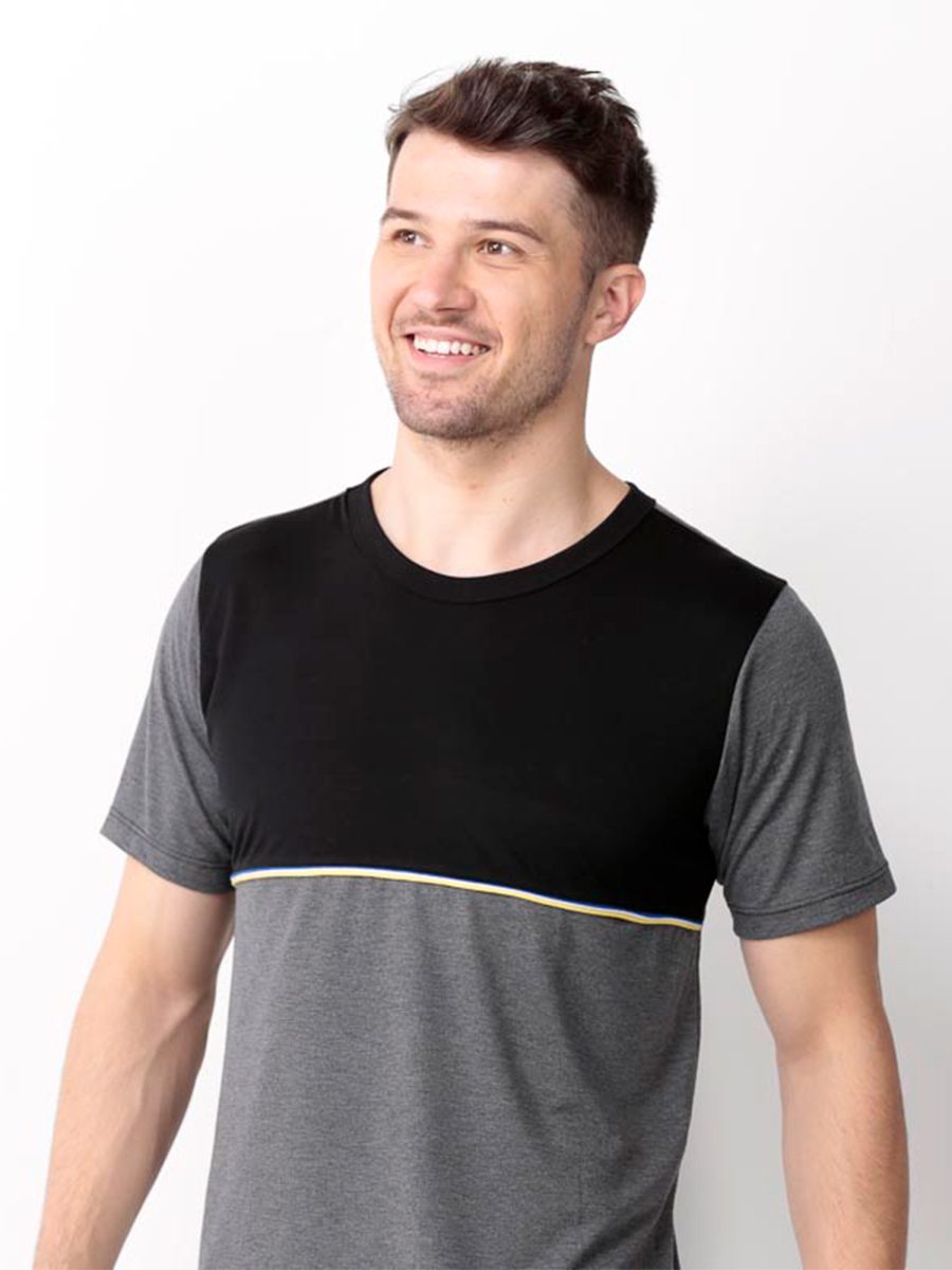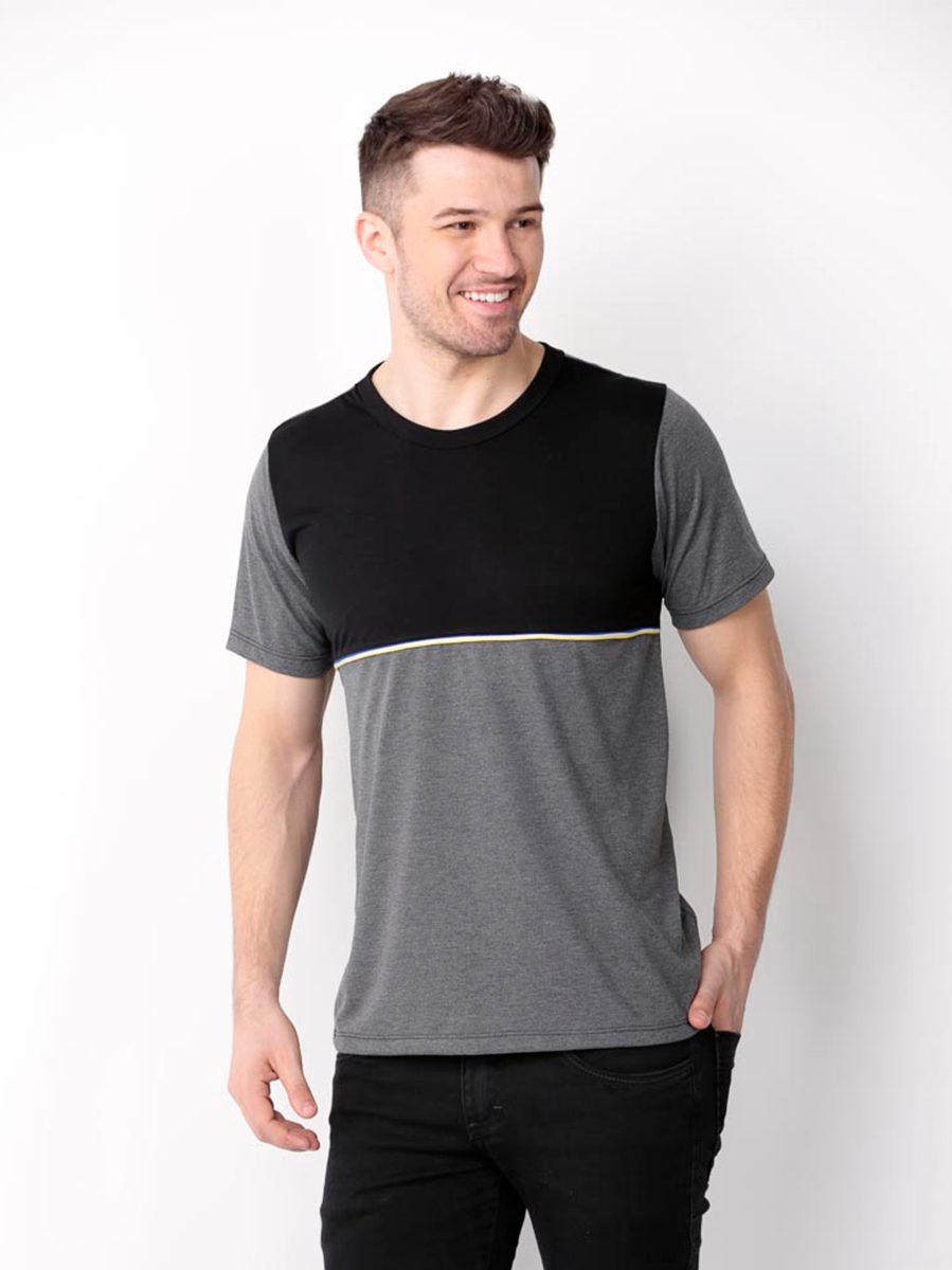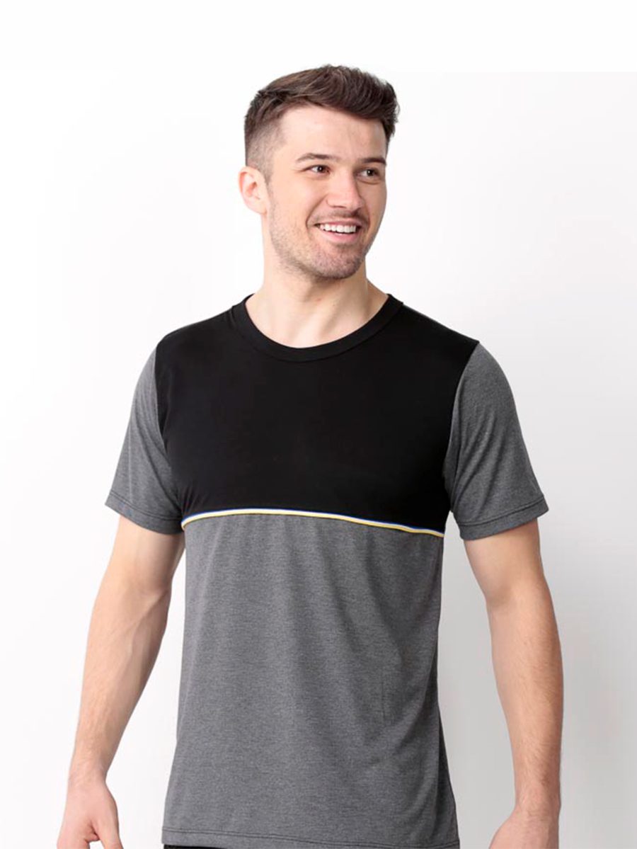 Camiseta masculina com recorte na parte frontal superior e detalhe em viés.