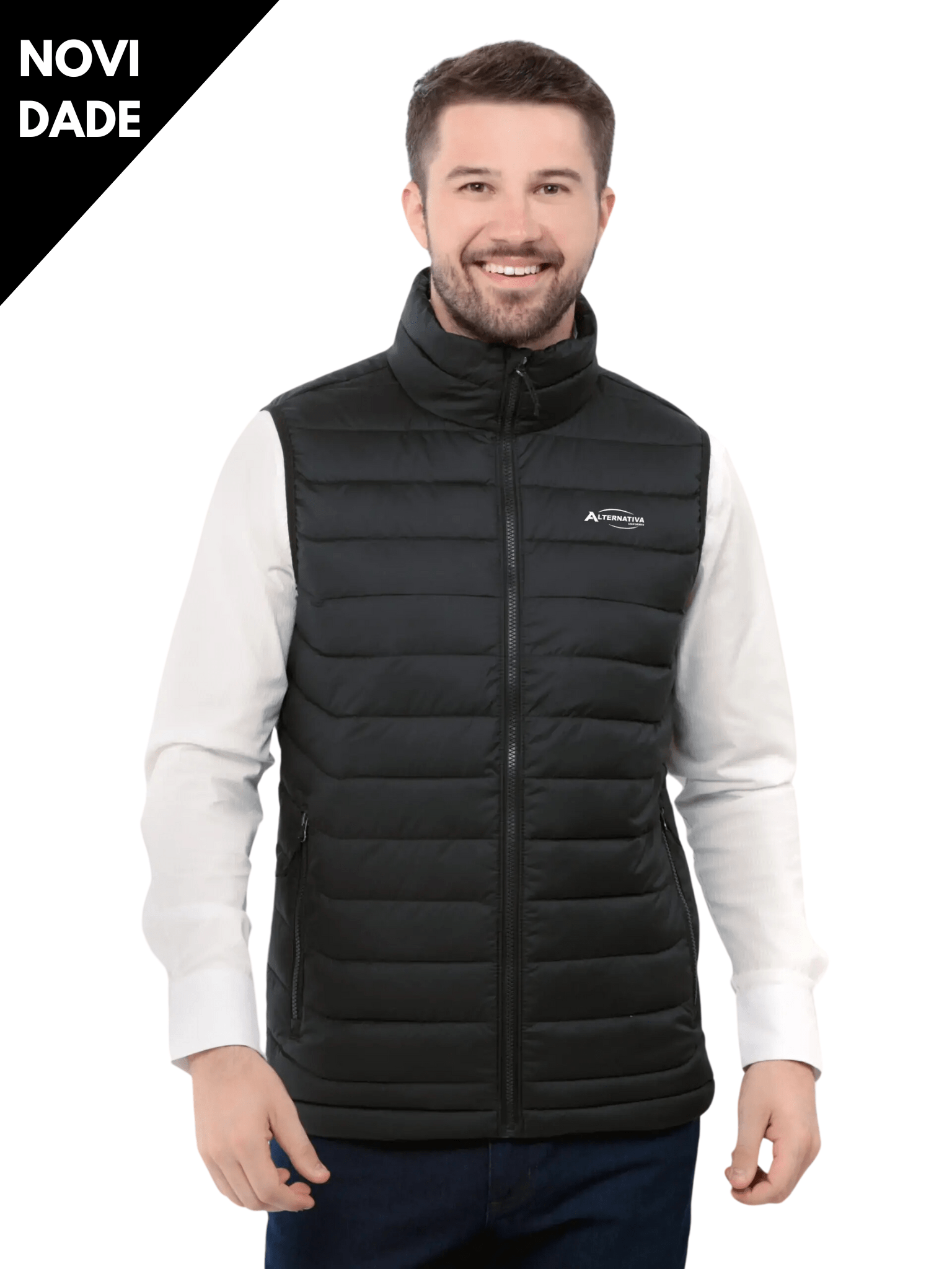 Colete puffer masculino, com zíper nos bolsos.