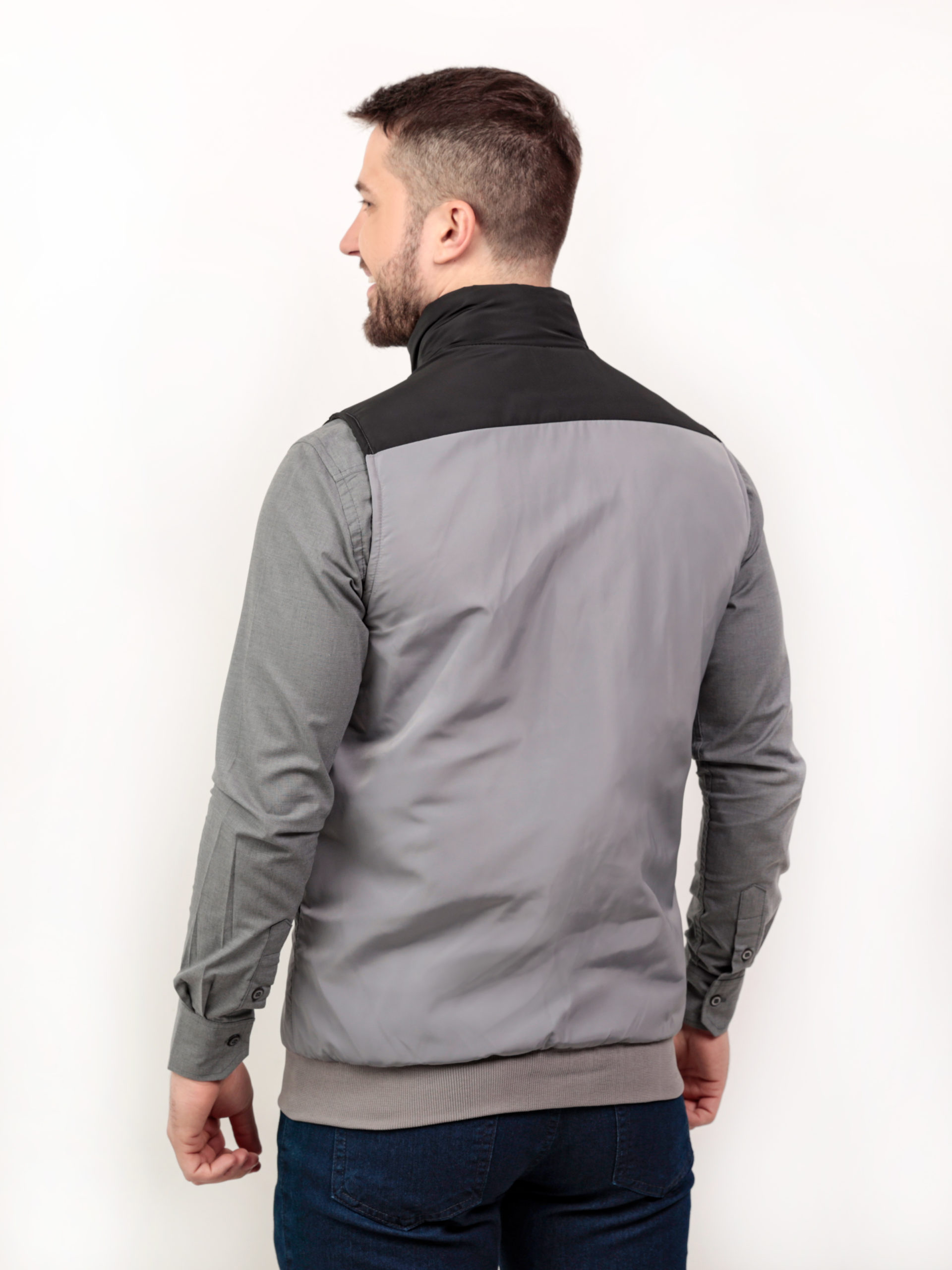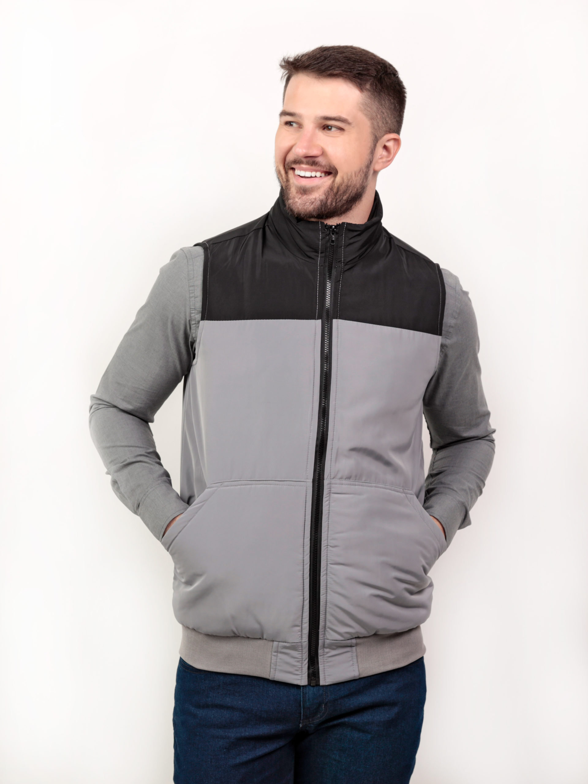 Colete masculino matelasse com detalhe de duas cores, cós de lã, bolso aplicado na frente.