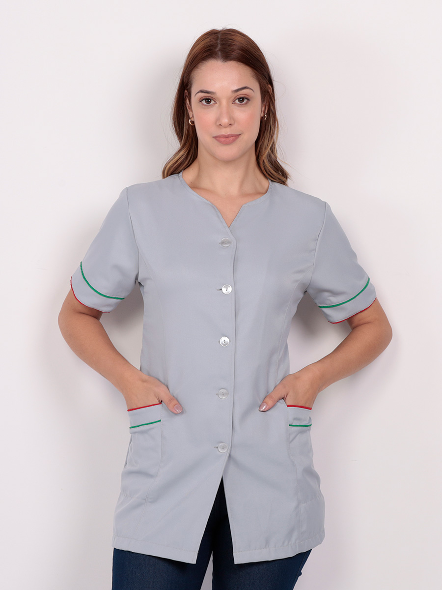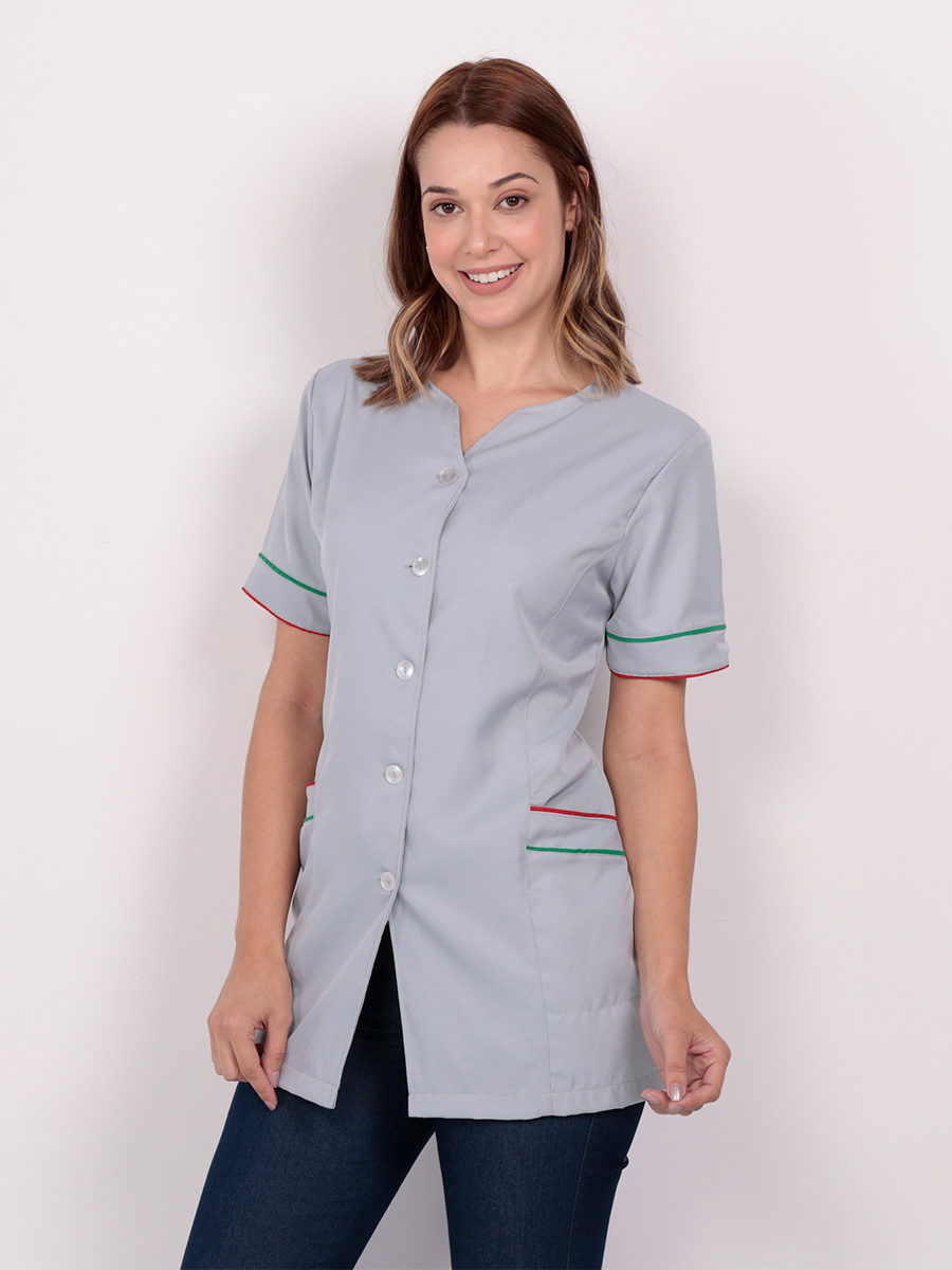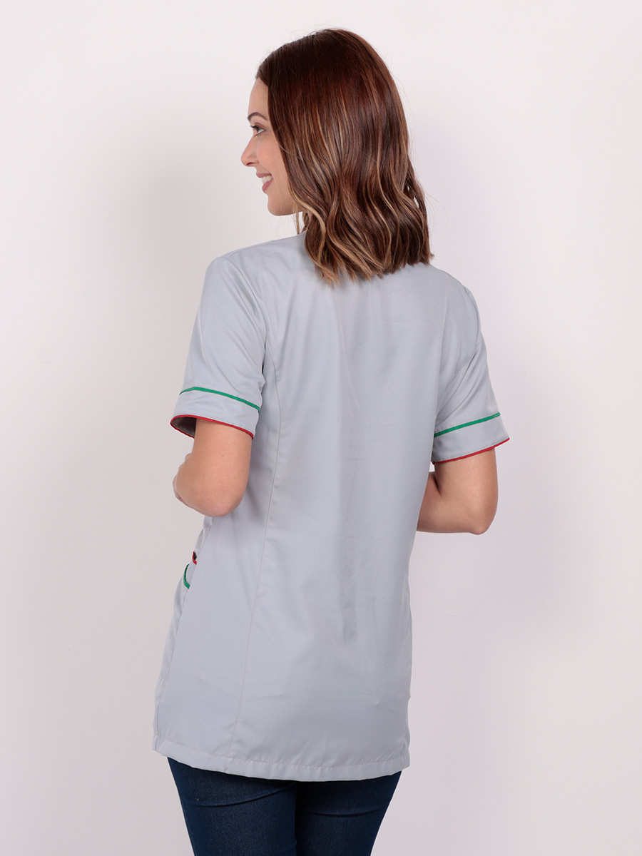 Jaleco feminino com detalhes em viés nas mangas e bolsos.