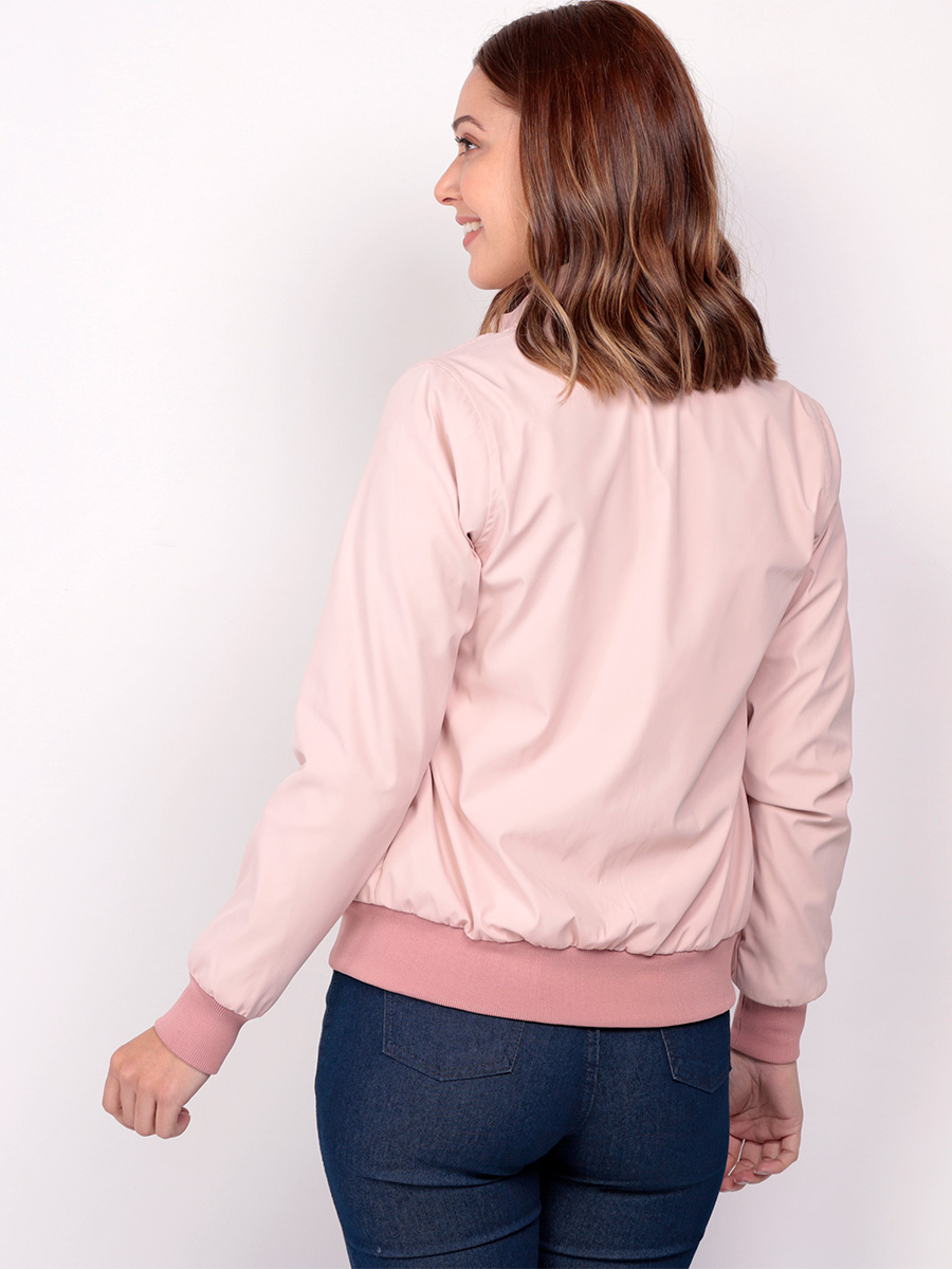 Jaqueta bomber feminina com zíper nos bolsos e lã na gola interna, punhos, e cós.