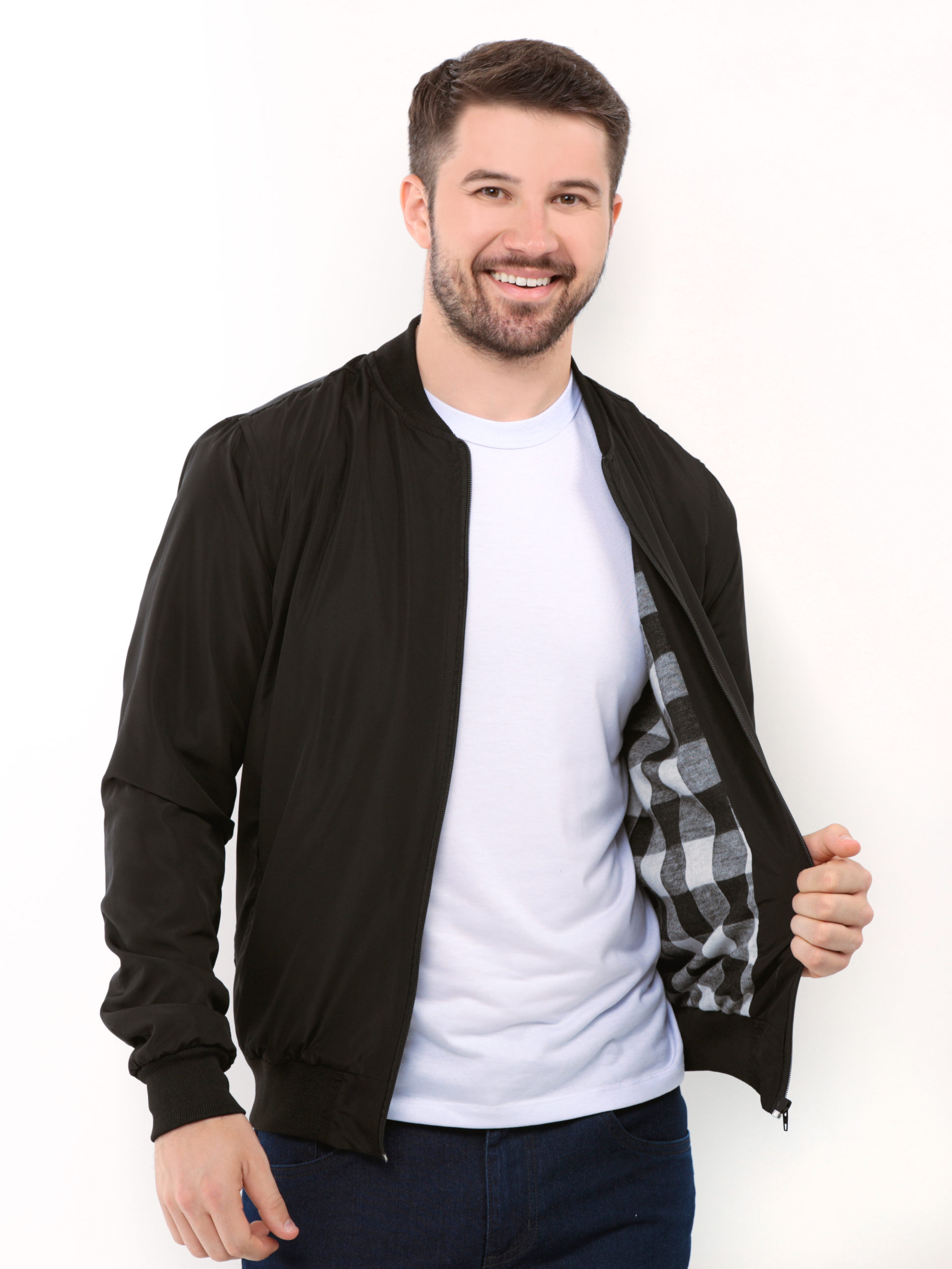 Jaqueta bomber masculina, com zípere nos bolsos e ribana nos punhos, cós e gola,forro flanelado.