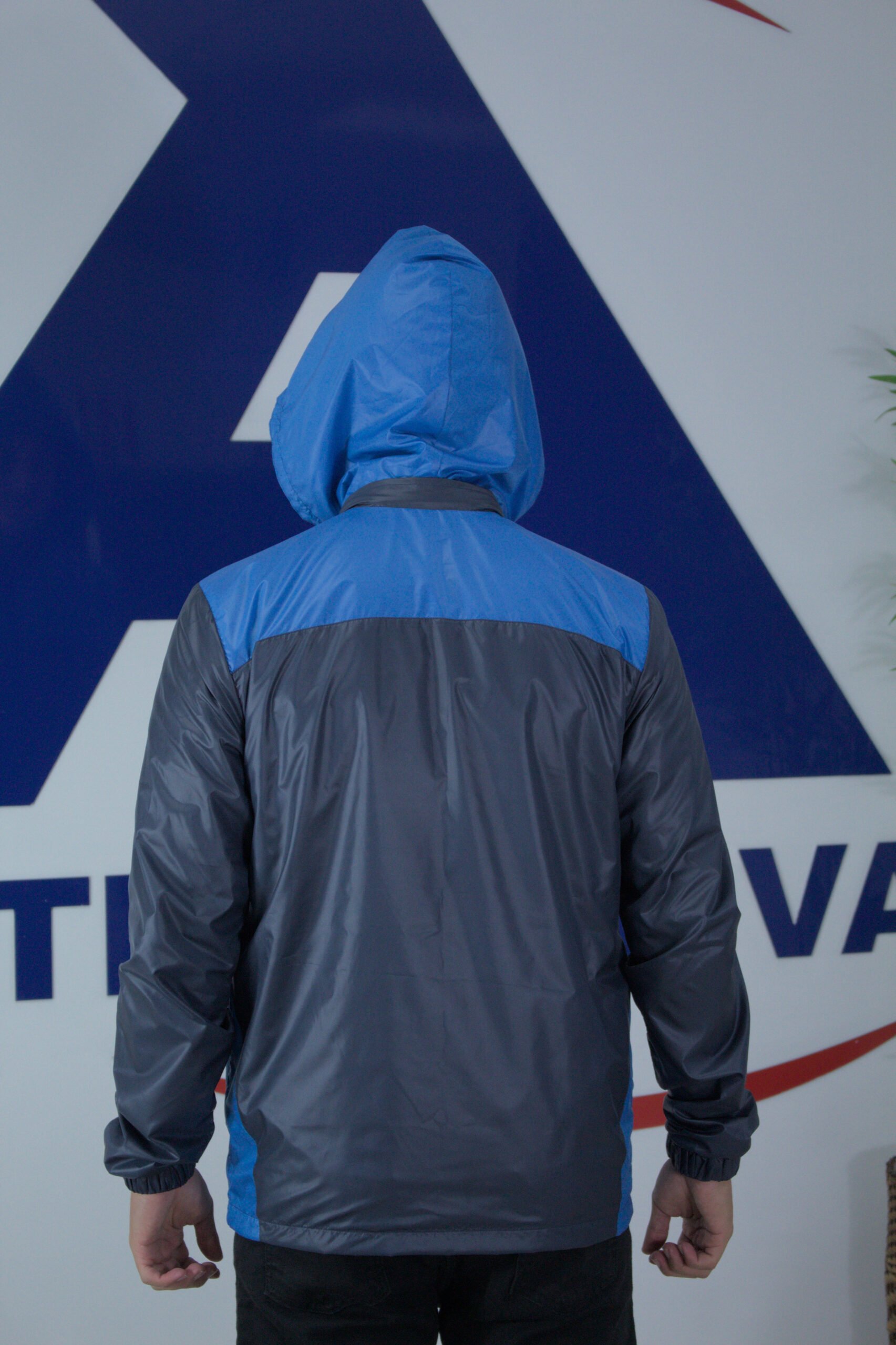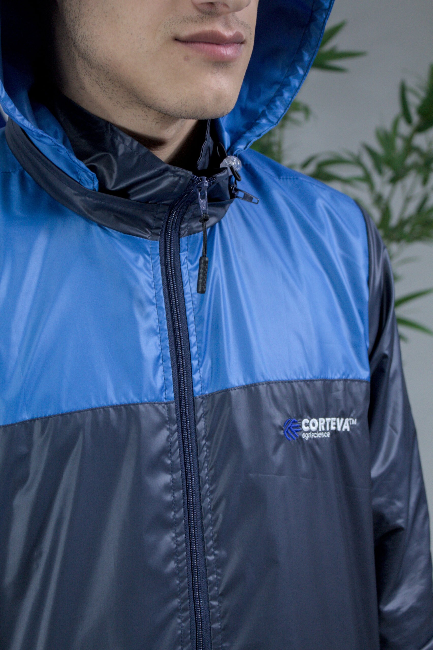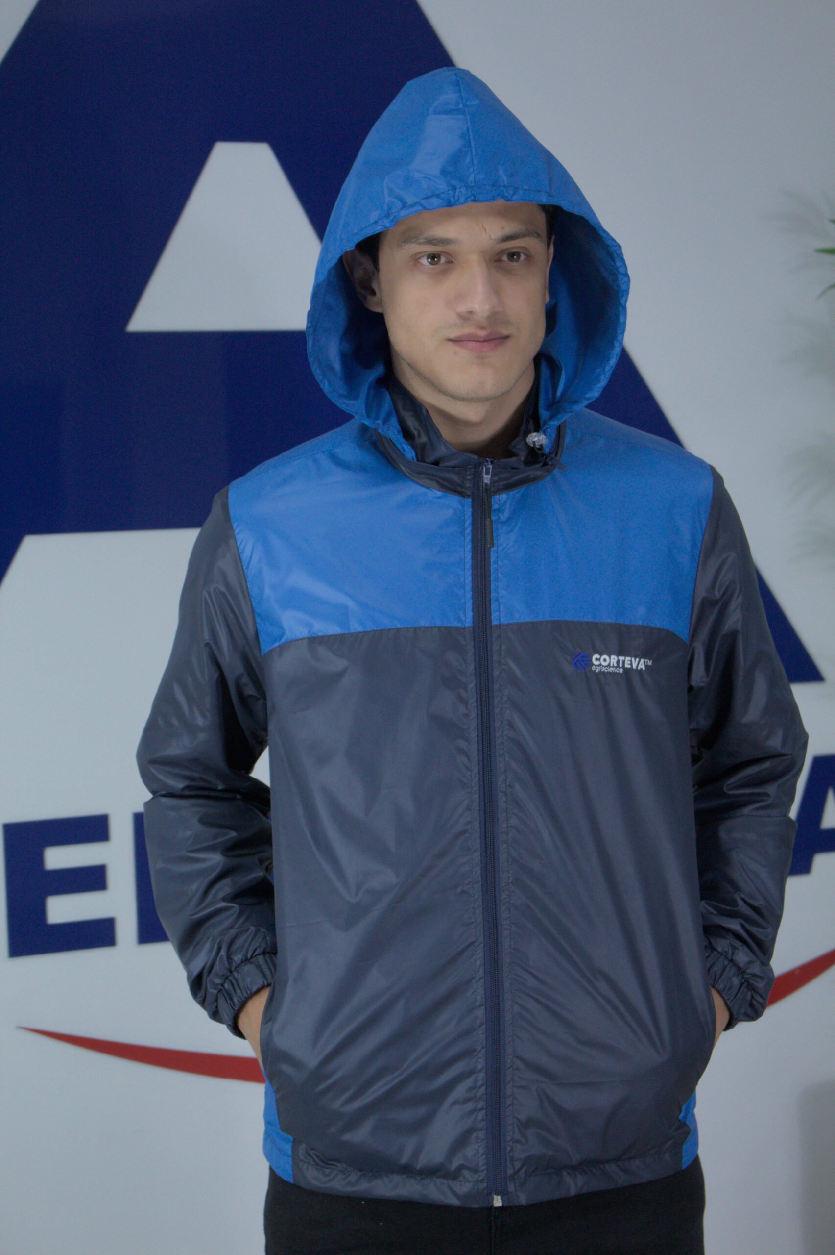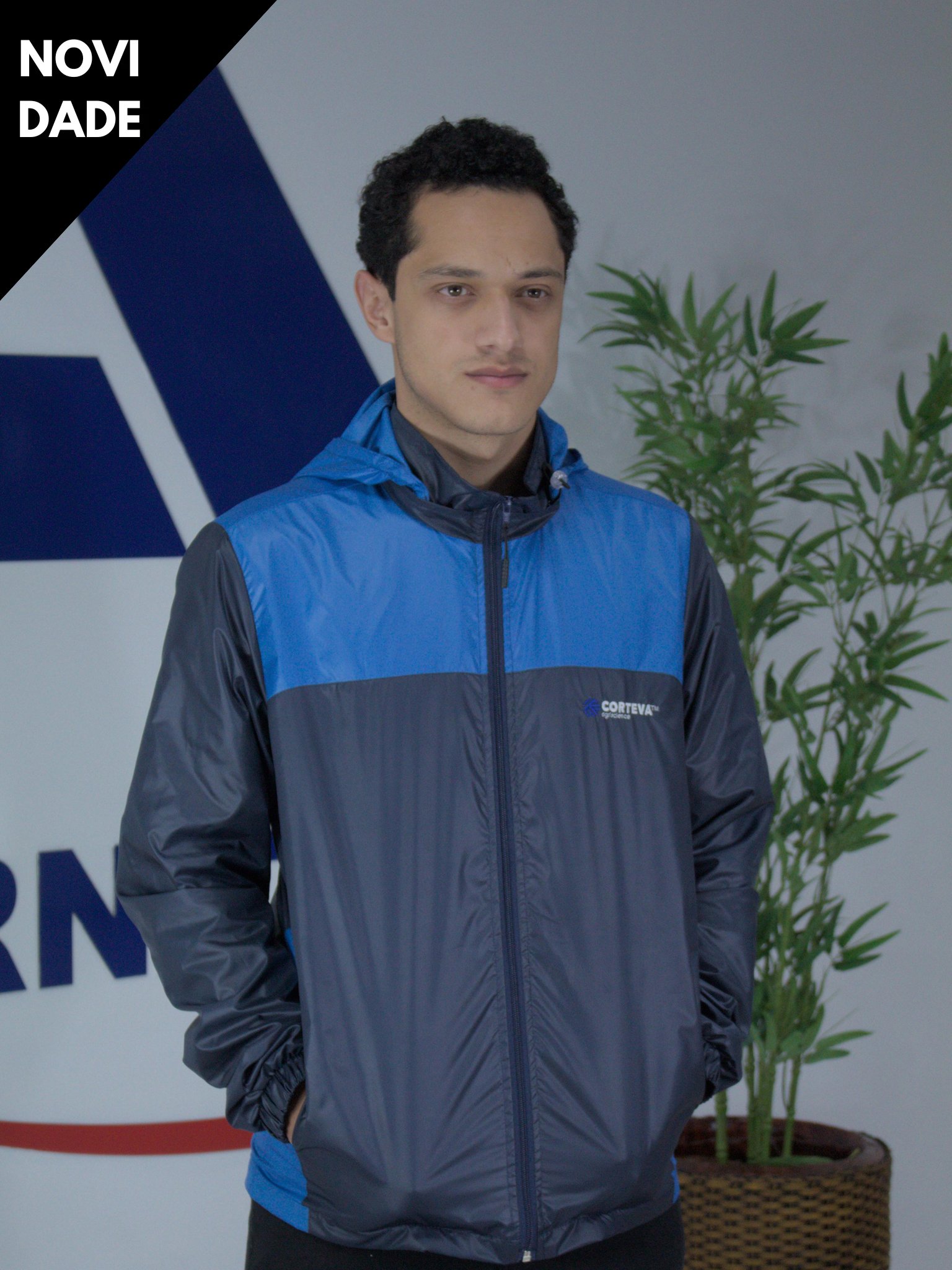 Jaqueta masculina corta vento, com capuz removível, recorte colorido, bolso na lateral, elástico na manga.