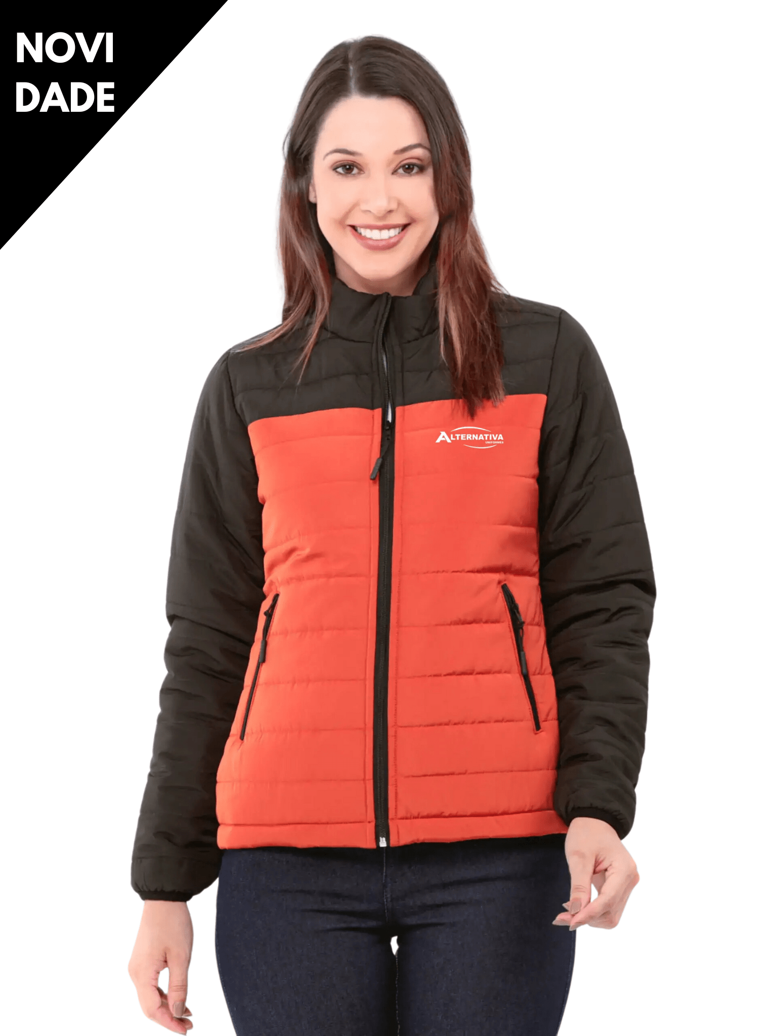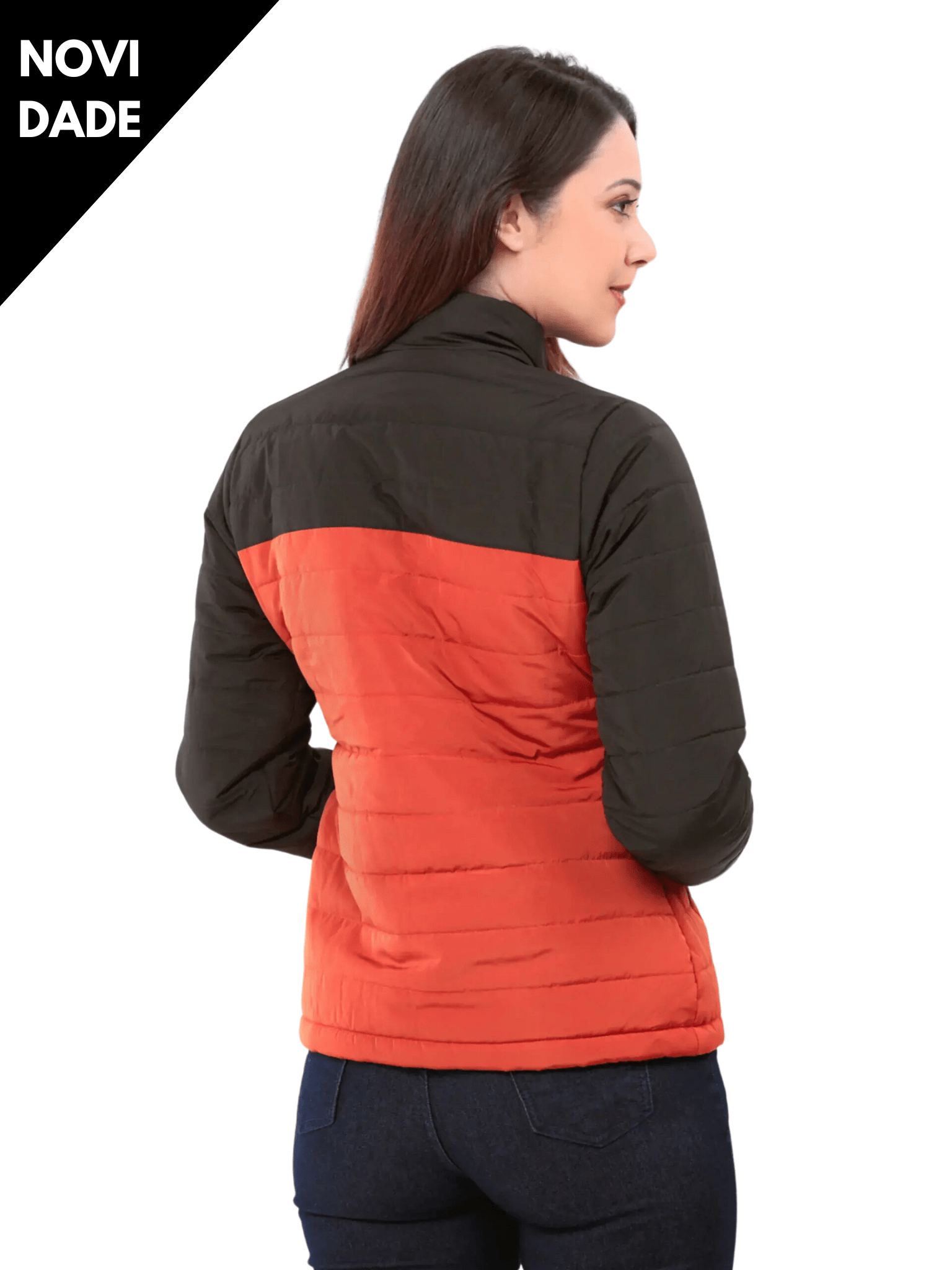 Jaqueta puffer feminina, com zíper nos bolsos, recorte frente e costas, e punho de elástico fino.