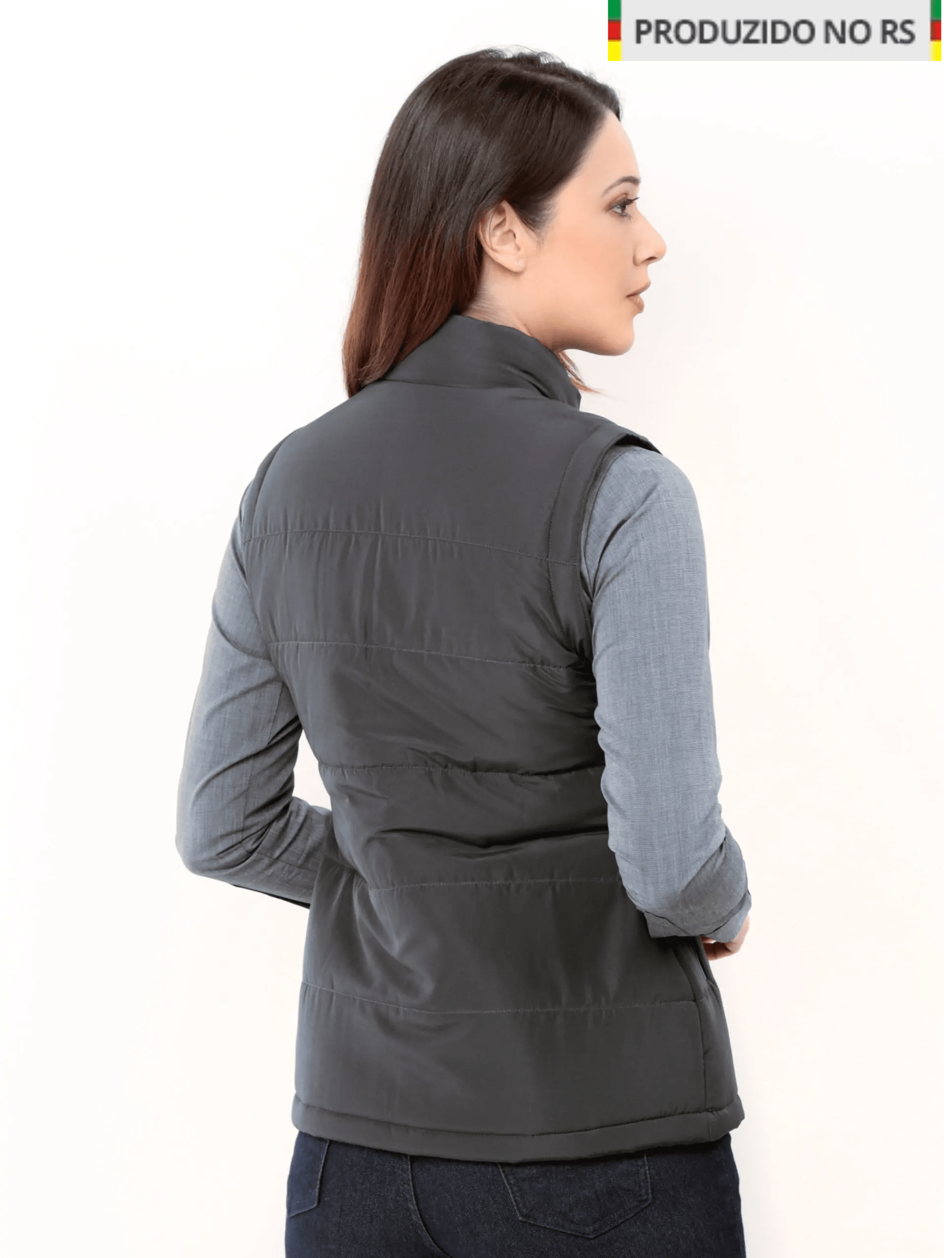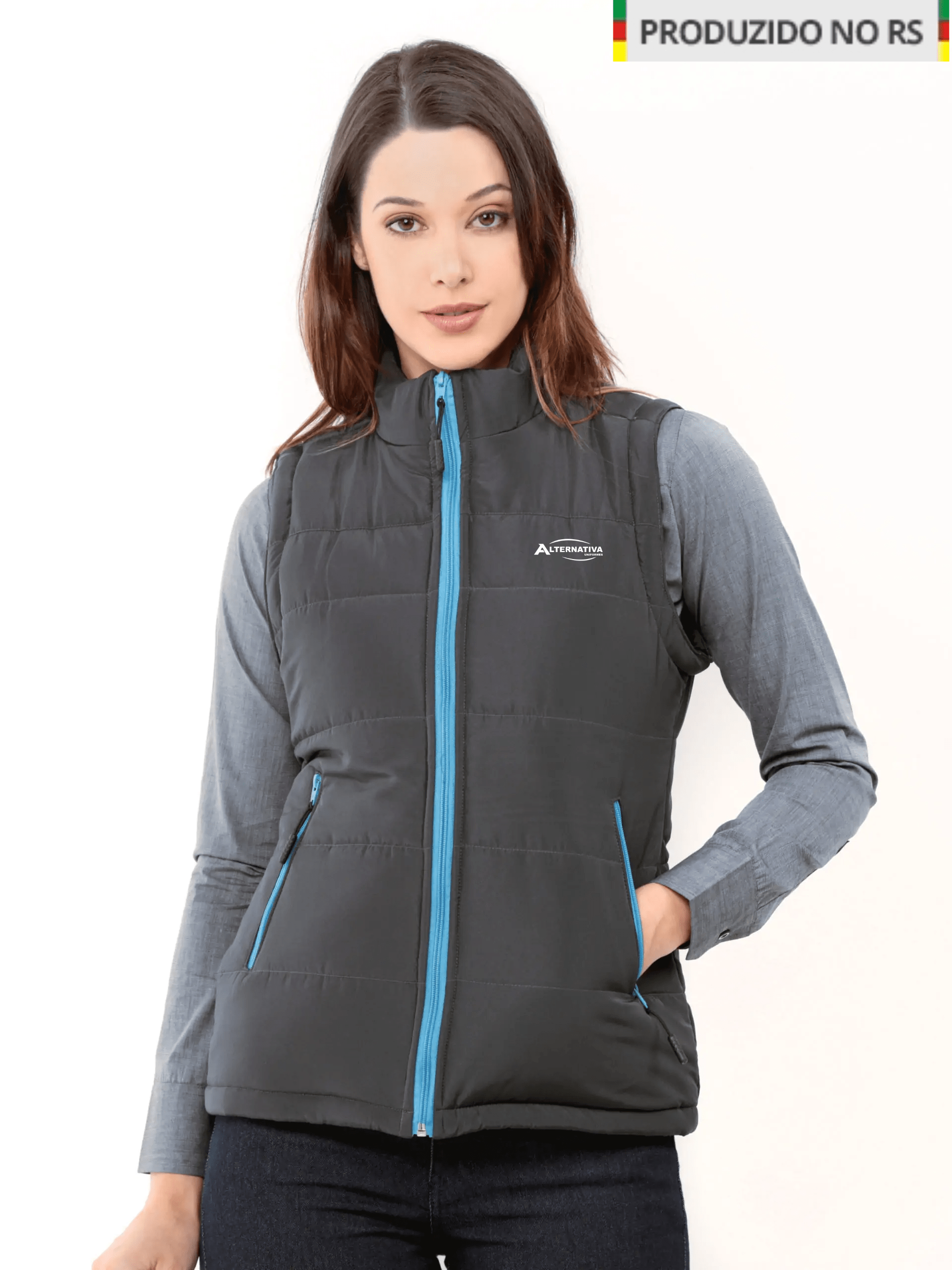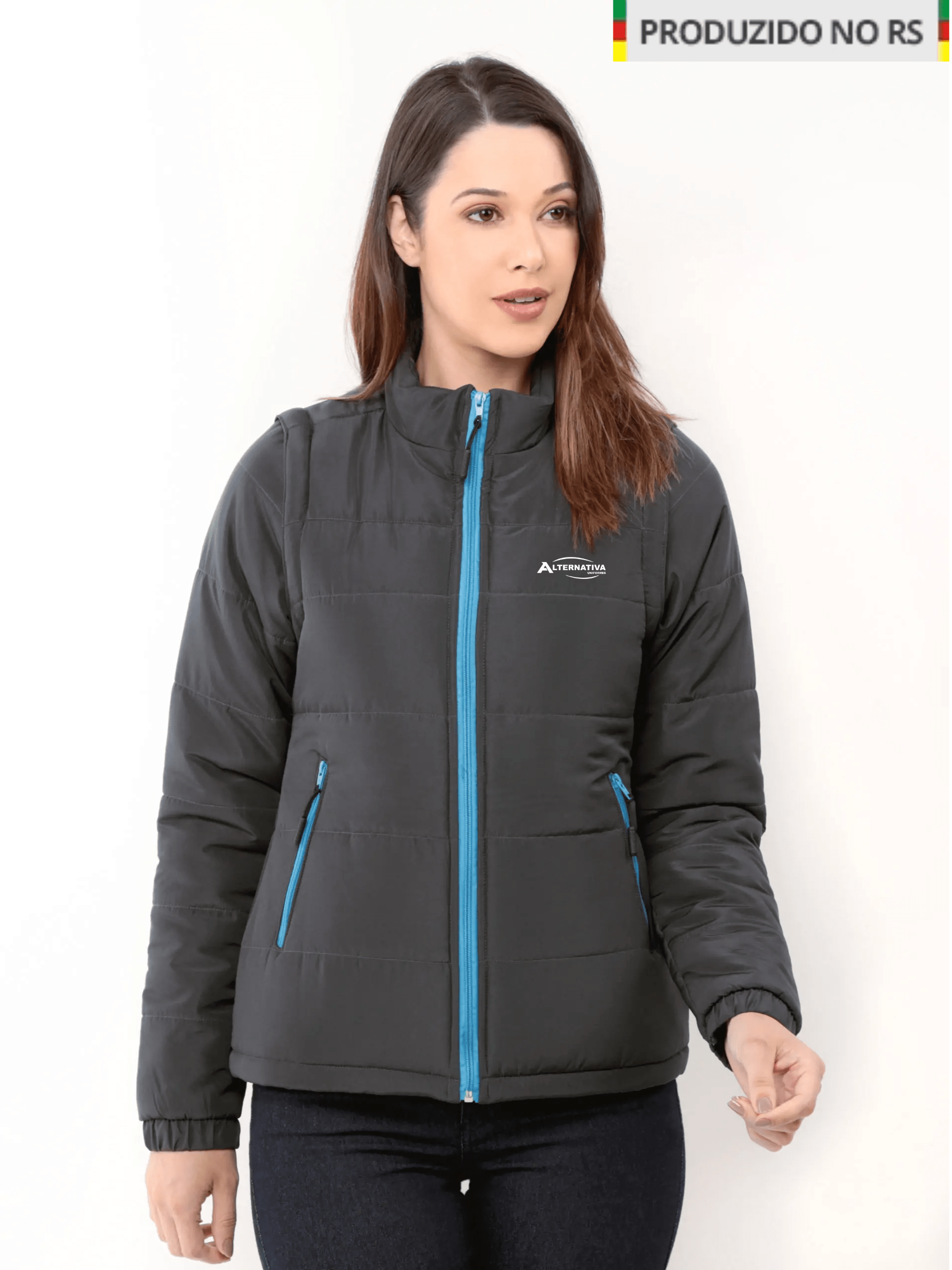 Jaqueta de gomos feminina vira colete, com zíper colorido nos bolsos e na frente.