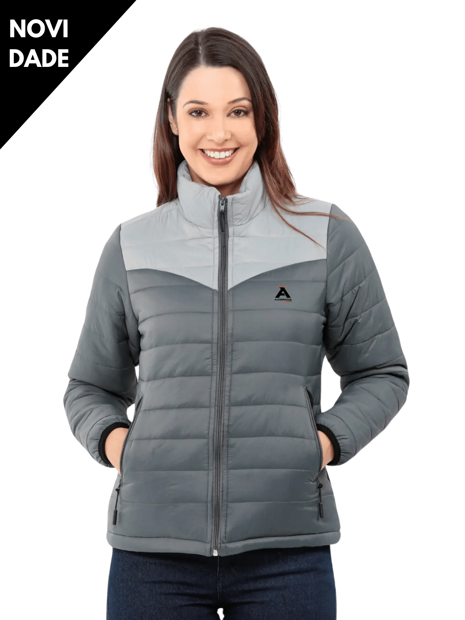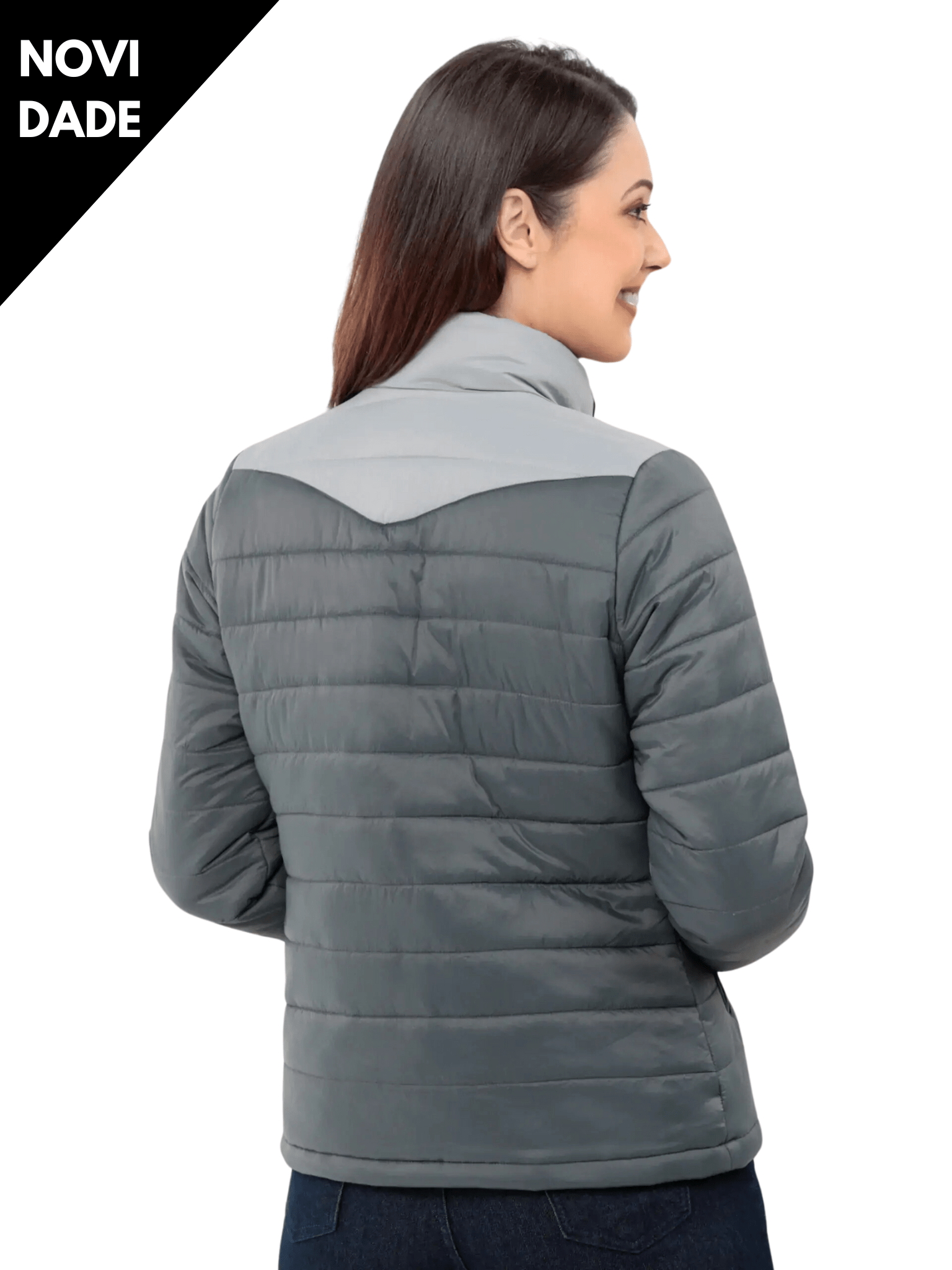 Jaqueta puffer feminina com recorte superior e zíper nos bolsos.