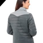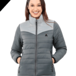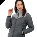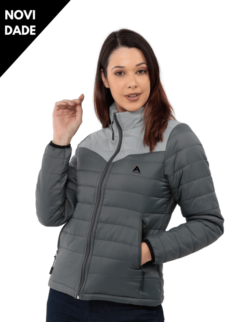 Jaqueta puffer feminina com recorte superior e zíper nos bolsos.