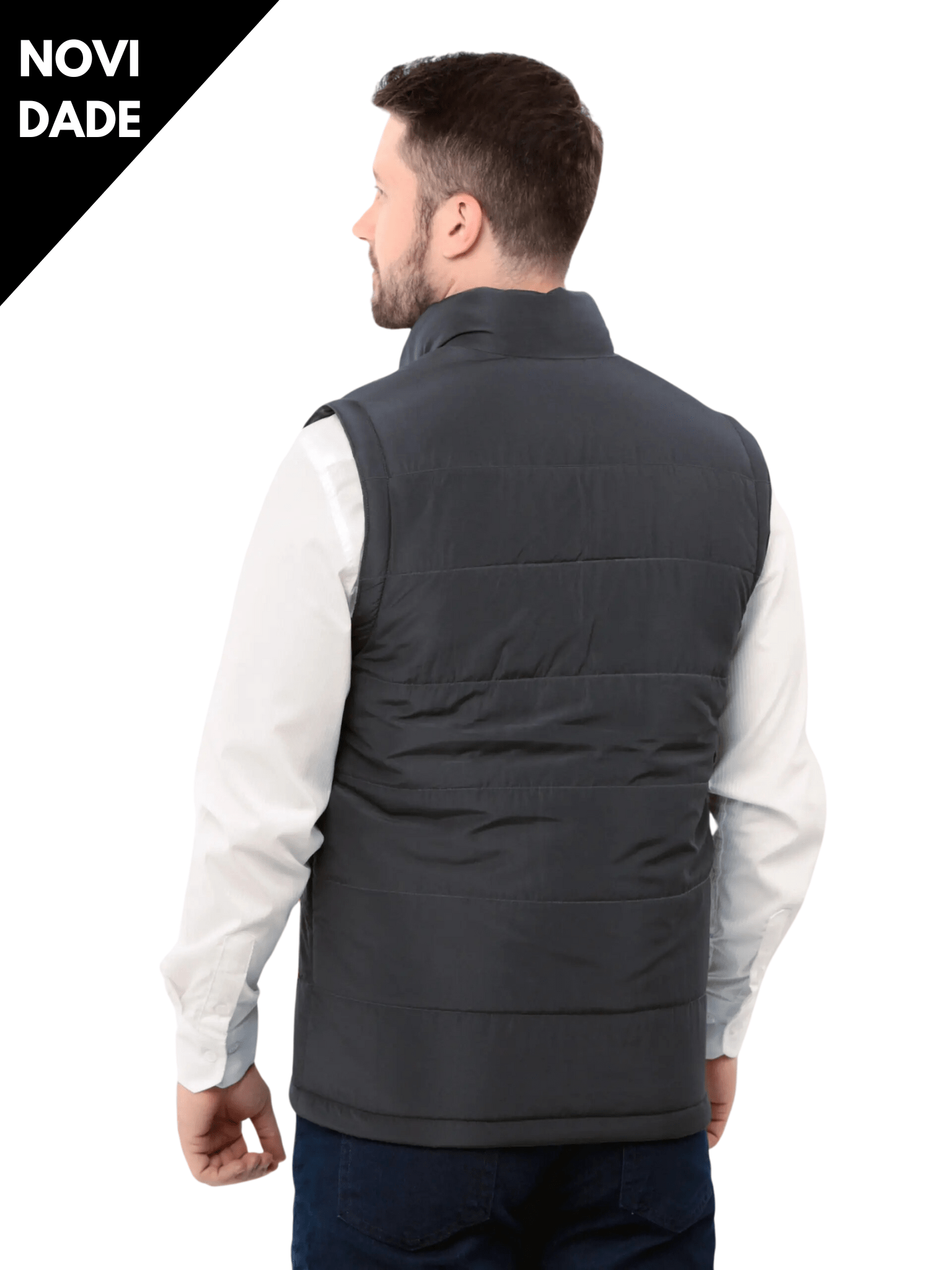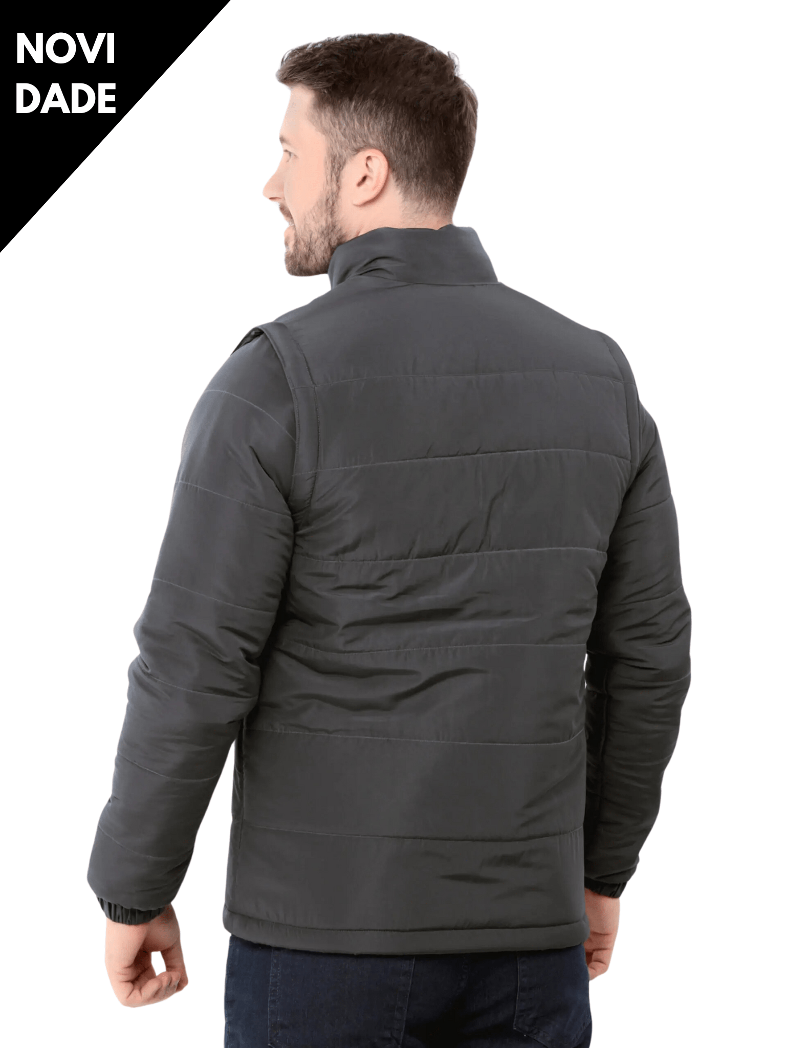 Jaqueta de gomos masculina vira colete, com zíper colorido nos bolsos e na frente.