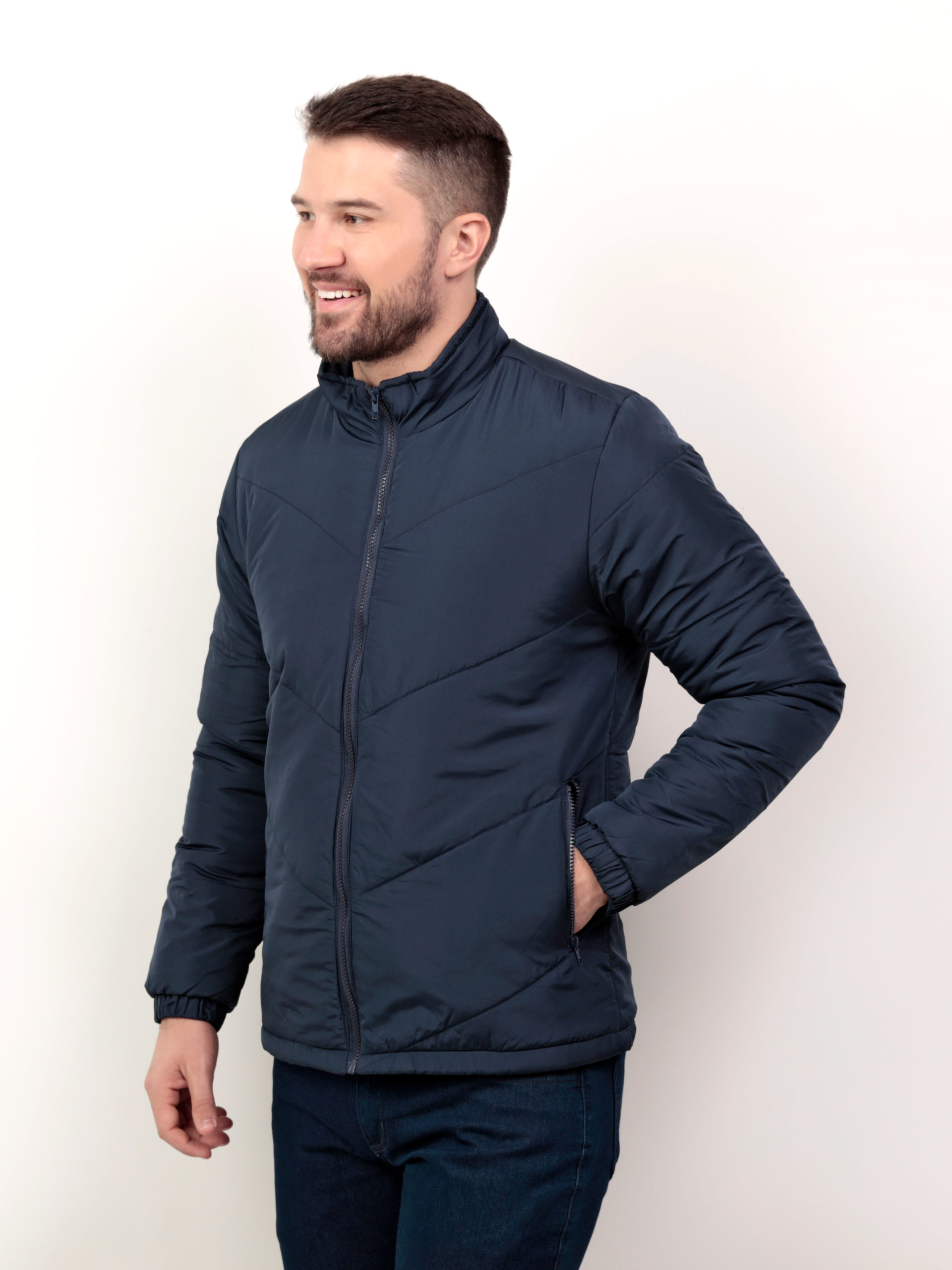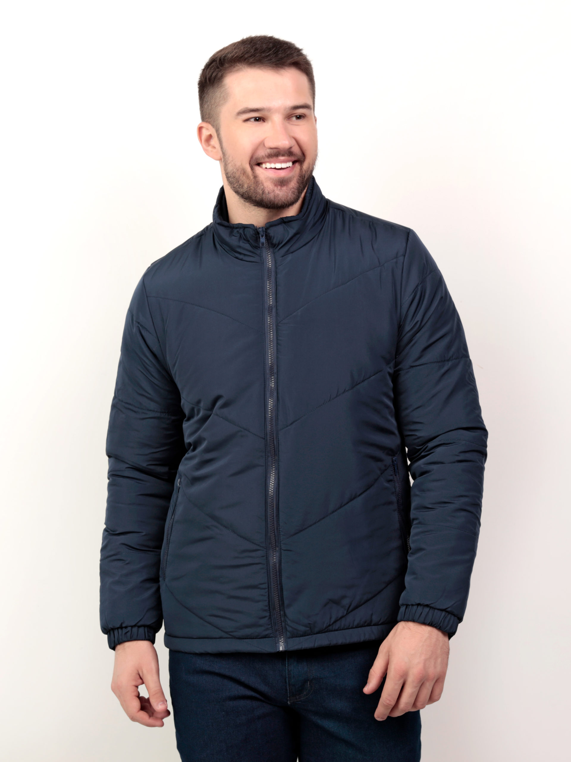Jaqueta masculina gomos 15cm na diagonal, bolso com zíper, punho com elástico encapado, cós barra.