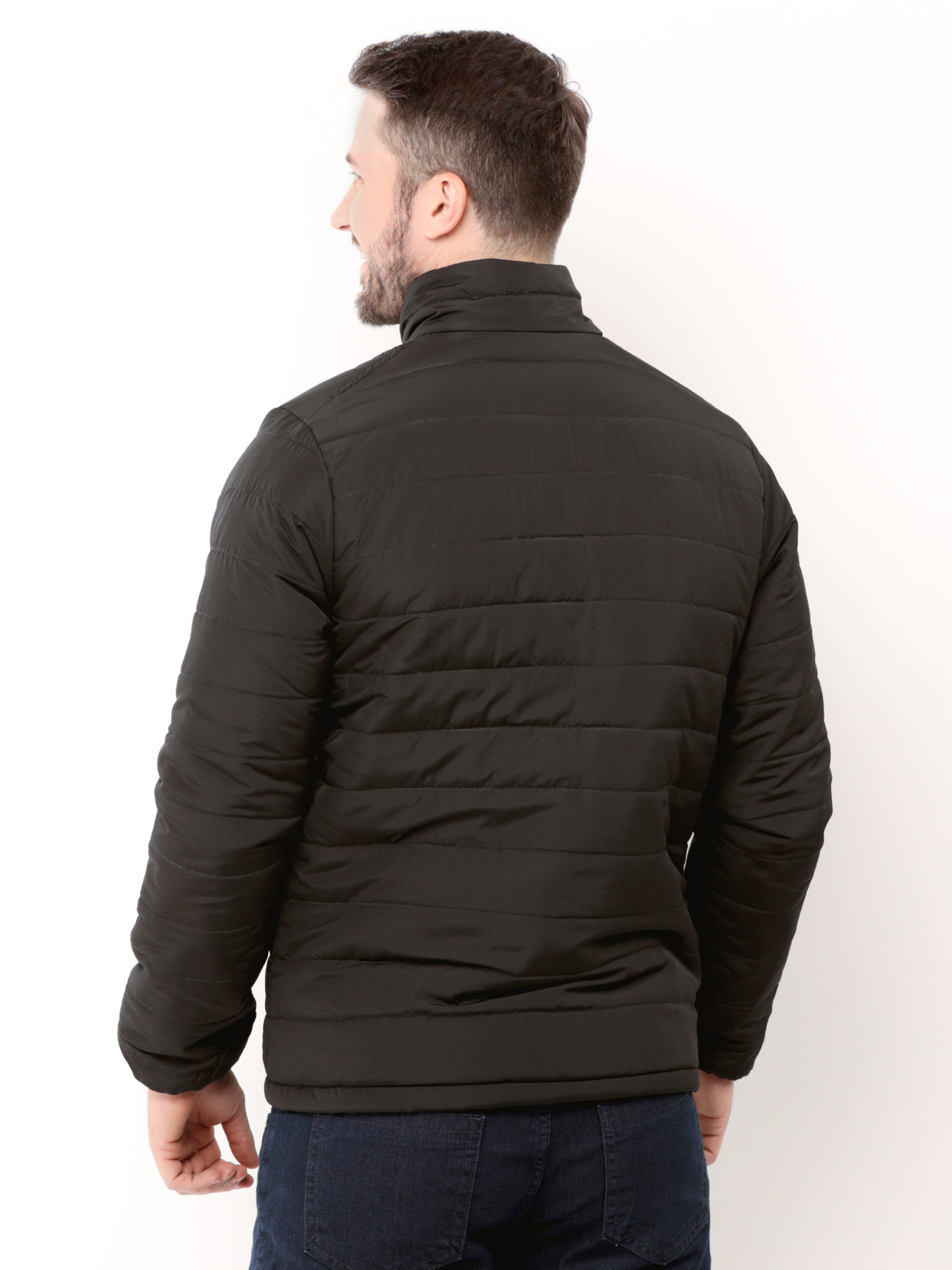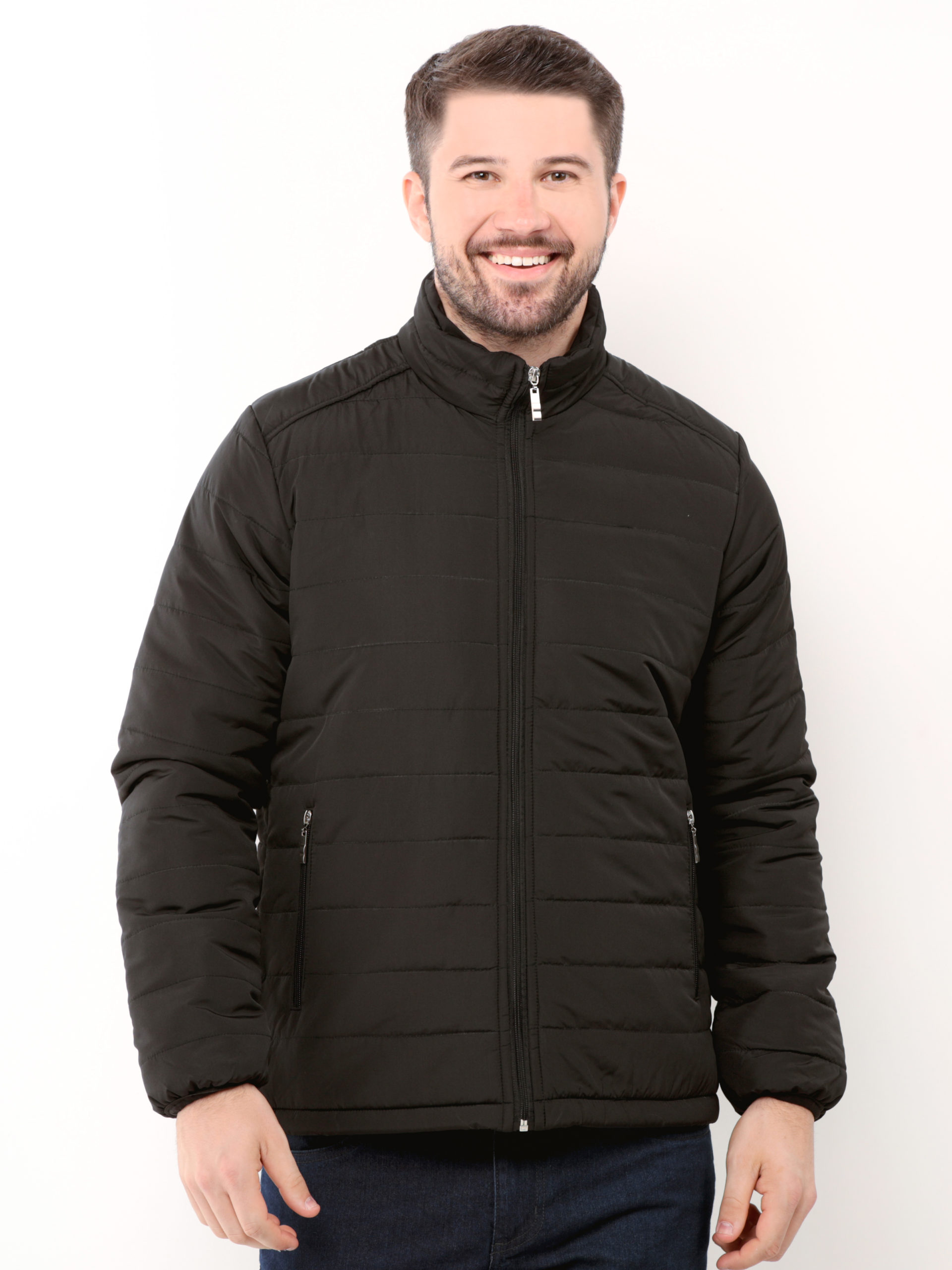 Jaqueta puffer masculina, com zíper nos bolsos e punhos de elástico fino.