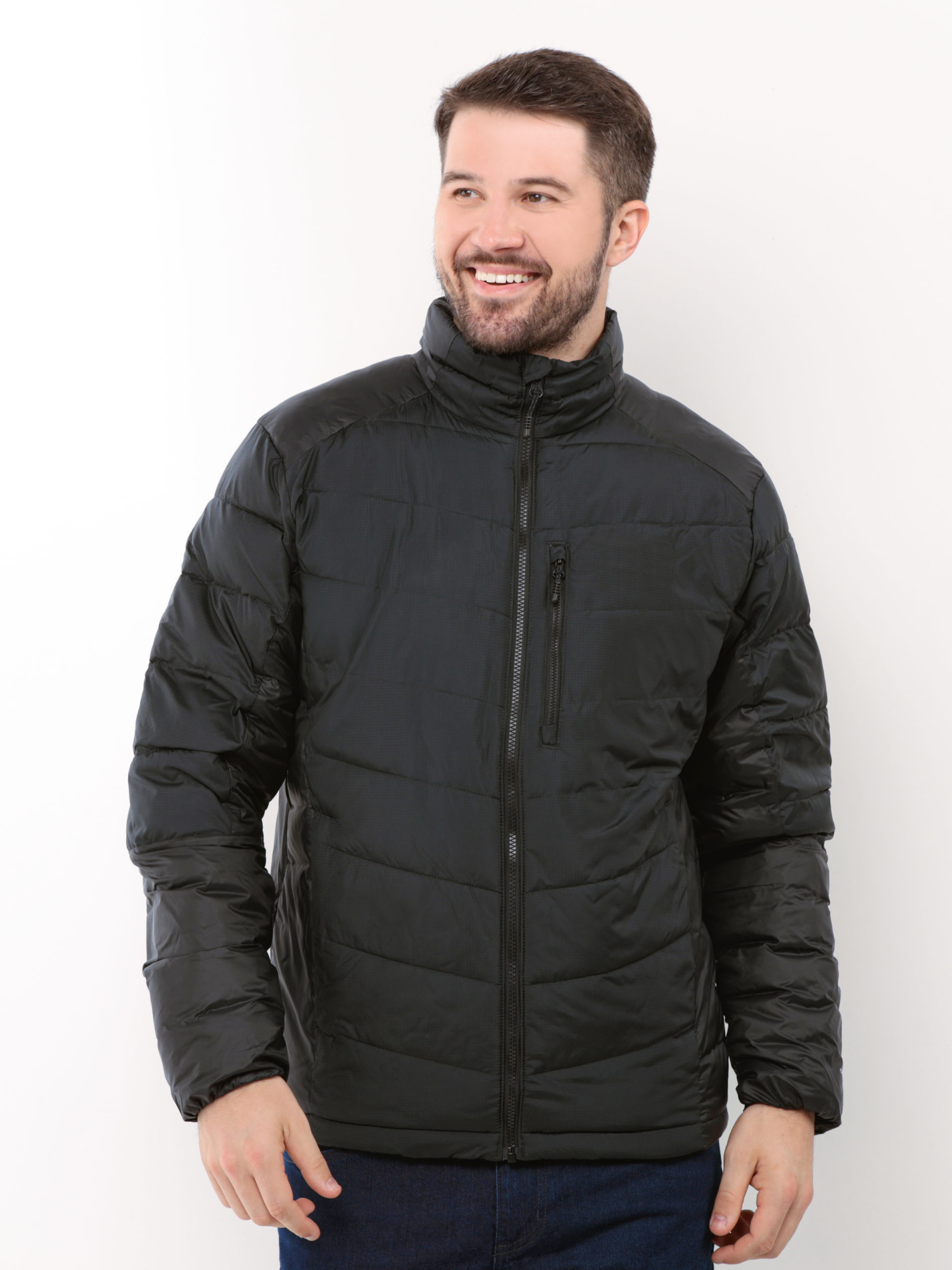 Jaqueta puffer masculina, 3 bolsos com zíper, barra no cós, punhos com elástico fino.