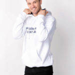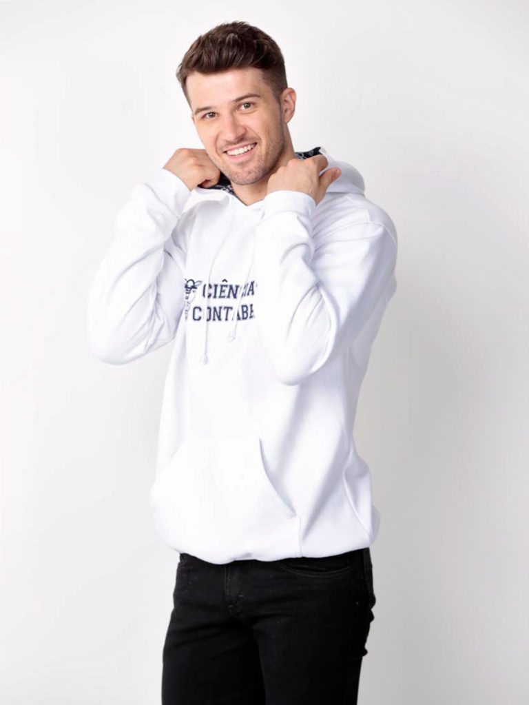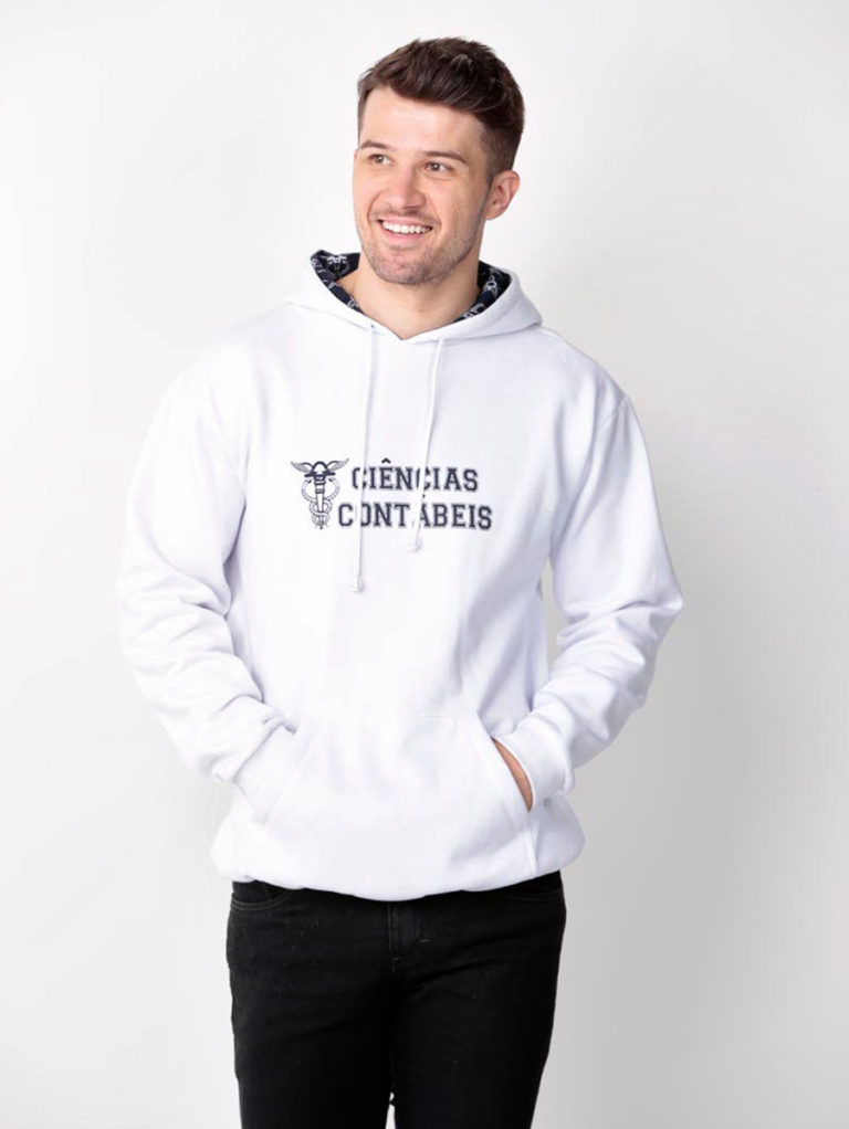 Moletom masculino, com capuz com recorte no meio com barra e casinha para passar cordão com forro interno colorido, bolso canguru preso com costura dupla e com barra de 2 cm, ribana colocada nos punhos e cós.