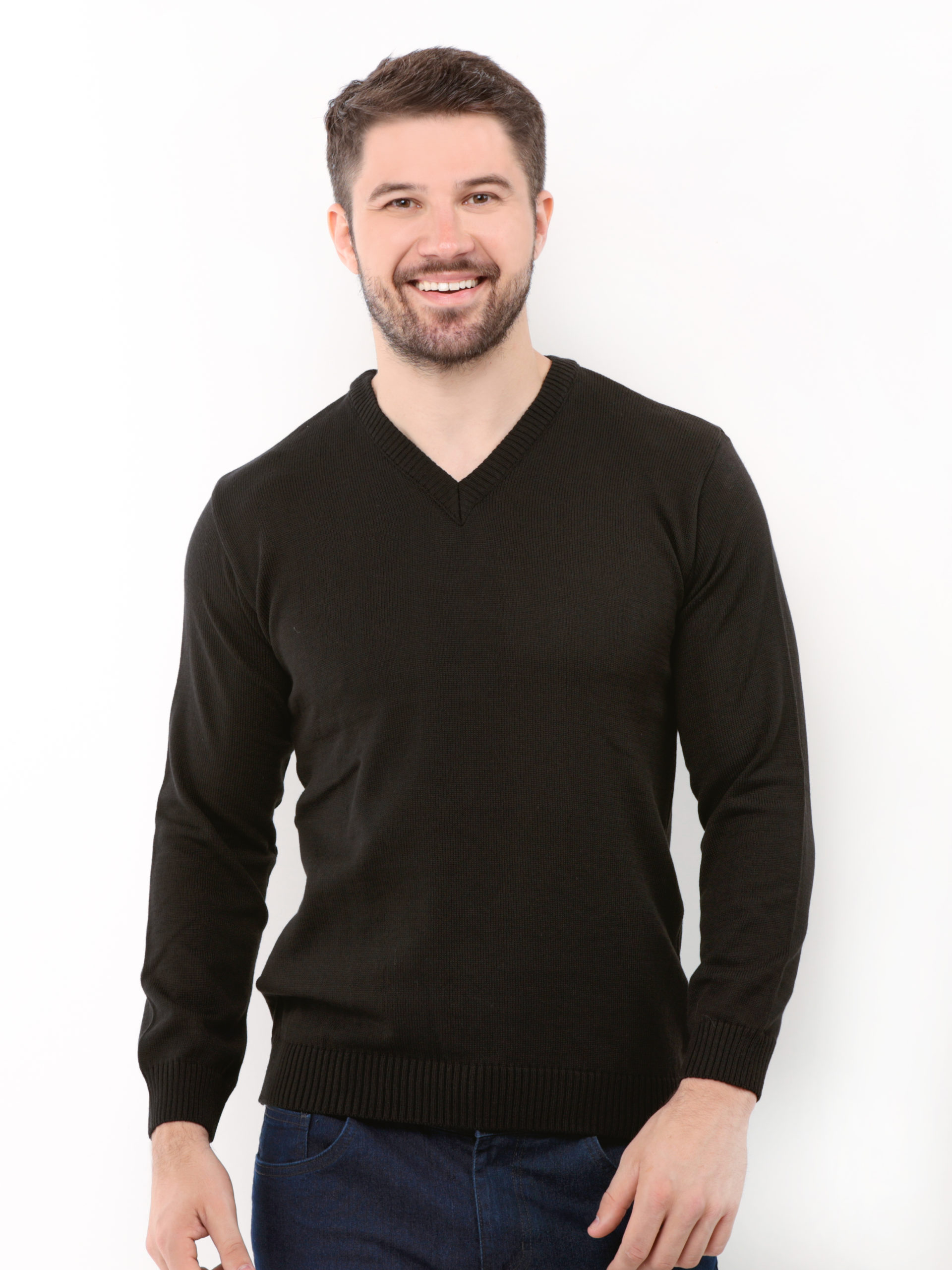 Suéter masculino tradicional com gola em v.